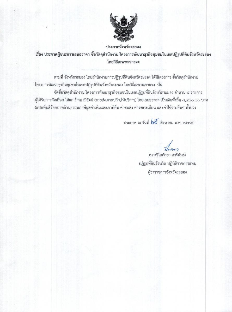 ประกาศจังหวัดระยอง เรื่อง ประกาศชนะการเสนอราคา จัดซื้อจัดจ้างวัสดุสำนักงาน โครงการพัฒนาธุรกิจชุมชนฯ จำนวน 5 รายการ โดยวิธีเฉพาะเจาะจง
