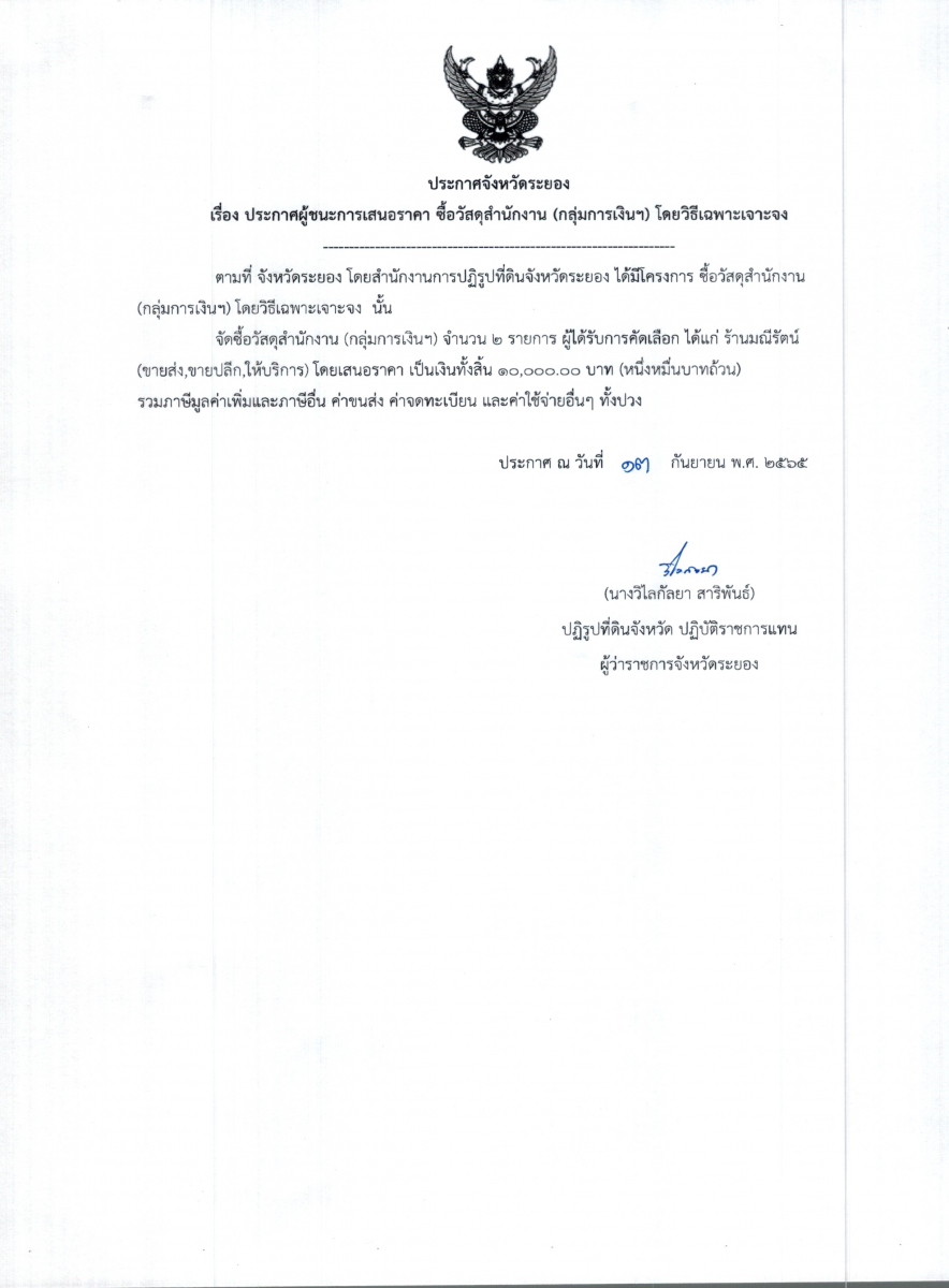 ประกาศจังหวัดระยอง เรื่อง ประกาศชนะการเสนอราคา จัดซื้อจัดจ้างวัสดุสำนักงาน (กลุ่มการเงินฯ) โดยวิธีเฉพาะเจาะจง