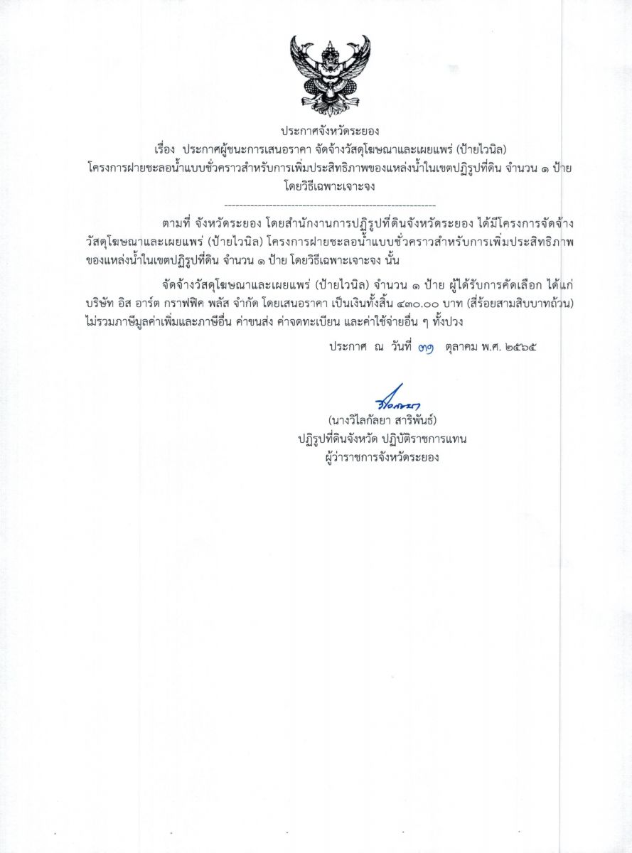 ประกาศจังหวัดระยอง เรื่อง ประกาศผู้ชนะการเสนอราคา จัดจ้างวัสดุโฆษณาและเผยแพร่ (ป้ายประชาสัมพันธ์) ประจำปีงบประมาณ พ.ศ. 2568 โดยวิธีเฉพาะเจาะจง