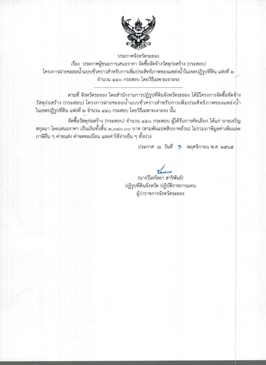 ประกาศจังหวัดระยอง เรื่อง ประกาศชนะการเสนอราคา จัดซื้อวัสดุก่อสร้าง (กระสอบ) โครงการฝายชะลอน้ำแบบชั่วคราวฯ แห่งที่ 2 จำนวน 440 กระสอบ โดยวิธีเฉพาะเจาะจง