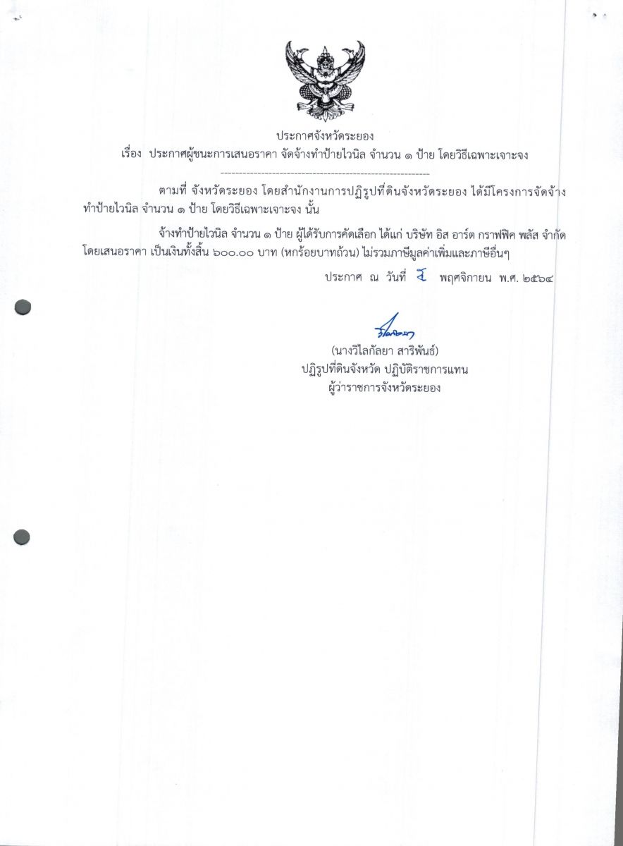 ประกาศจังหวัดระยอง เรื่อง ประกาศผู้ชนะการเสนอราคา จัดจ้างทำป้ายไวนิล จำนวน 1 ป้าย โดยวิธีเฉพาะเจาะจง