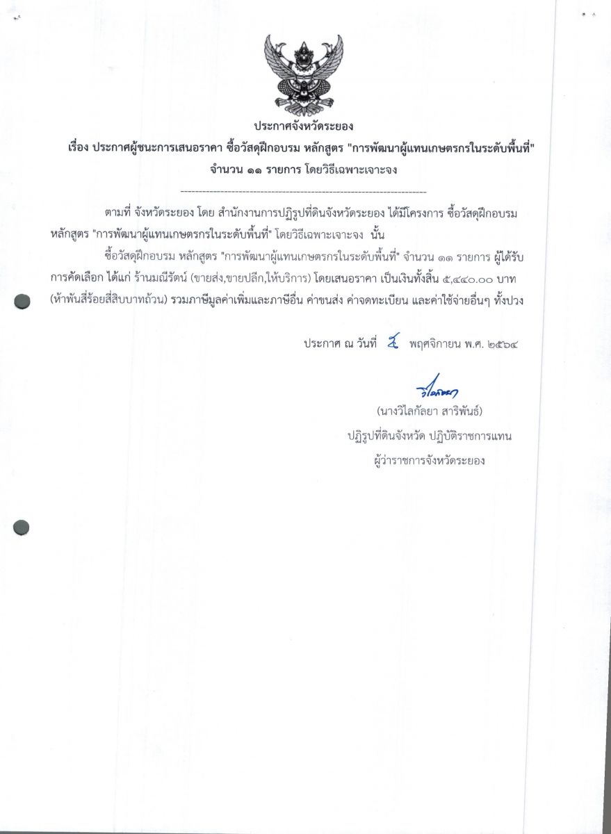 ประกาศจังหวัดระยอง เรื่อง ประกาศผู้ชนะการเสนอราคา จัดซื้อวัสดุฝึกอบรม หลักสูตรการพัฒนาผู้แทนเกษตรกรในระดับพื้นที่ จำนวน 11 รายการ โดยวิธีเฉพาะเจาะจง