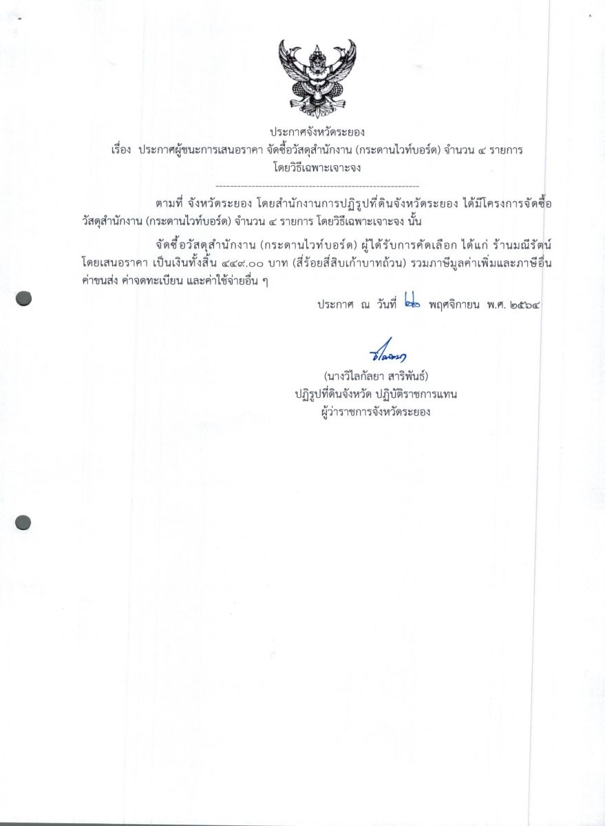 ประกาศจังหวัดระยอง เรื่อง ประกาศผู้ชนะการเสนอราคา จัดซื้อวัสดุสำนักงาน (กระดาษไวท์บอร์ด) จำนวน 4 รายการ โดยวิธีเฉพาะเจาะจง