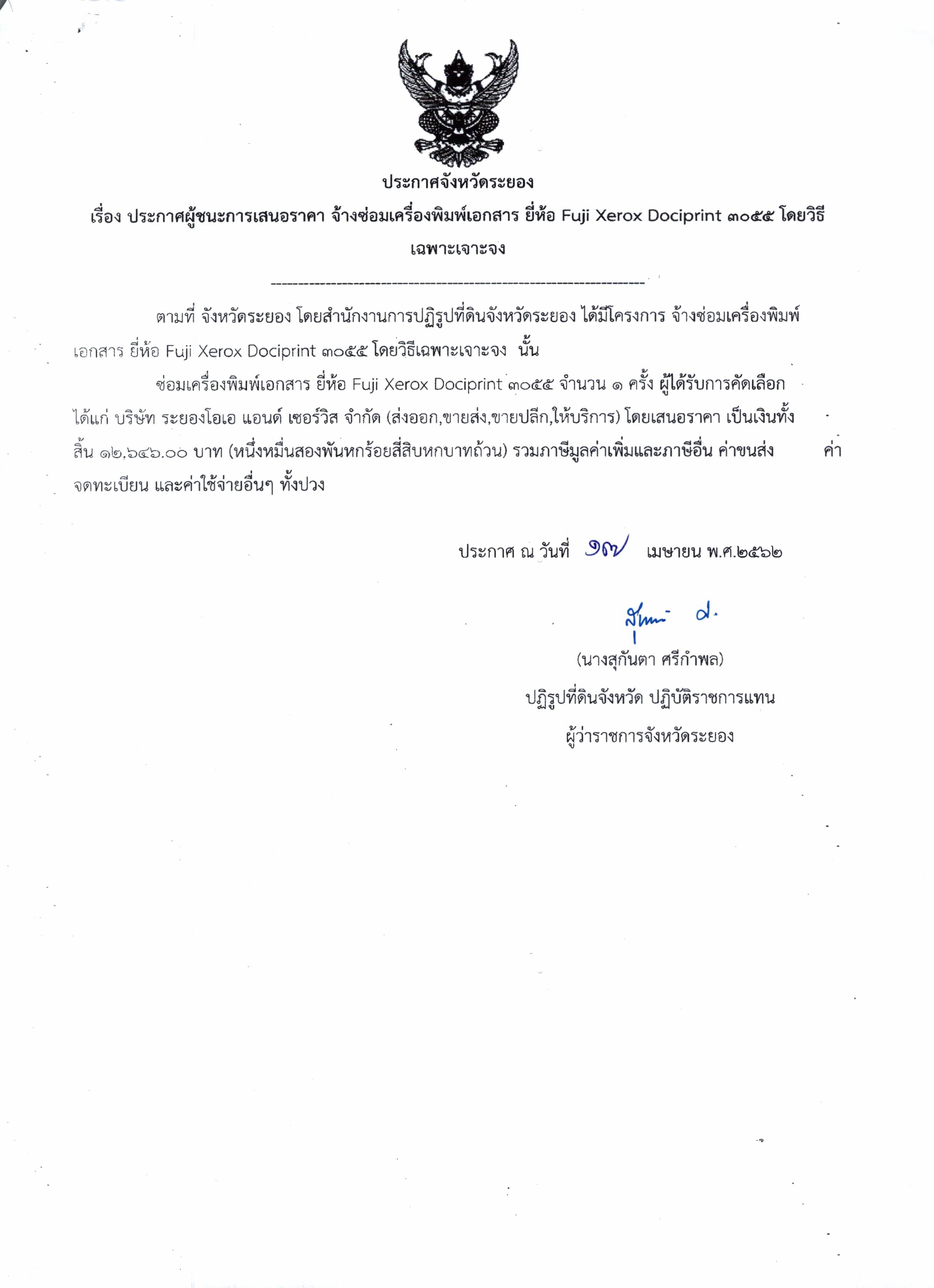 ประกาศจังหวัดระยอง เรื่อง ประกาศผู้ชนะการเสนอราคา จัดซ่อมเครื่องพิมพ์เอกสาร ยี่ห้อ Fuji Xerox Dociprint 3055 โดยวิธีเฉพาะเจาะจง