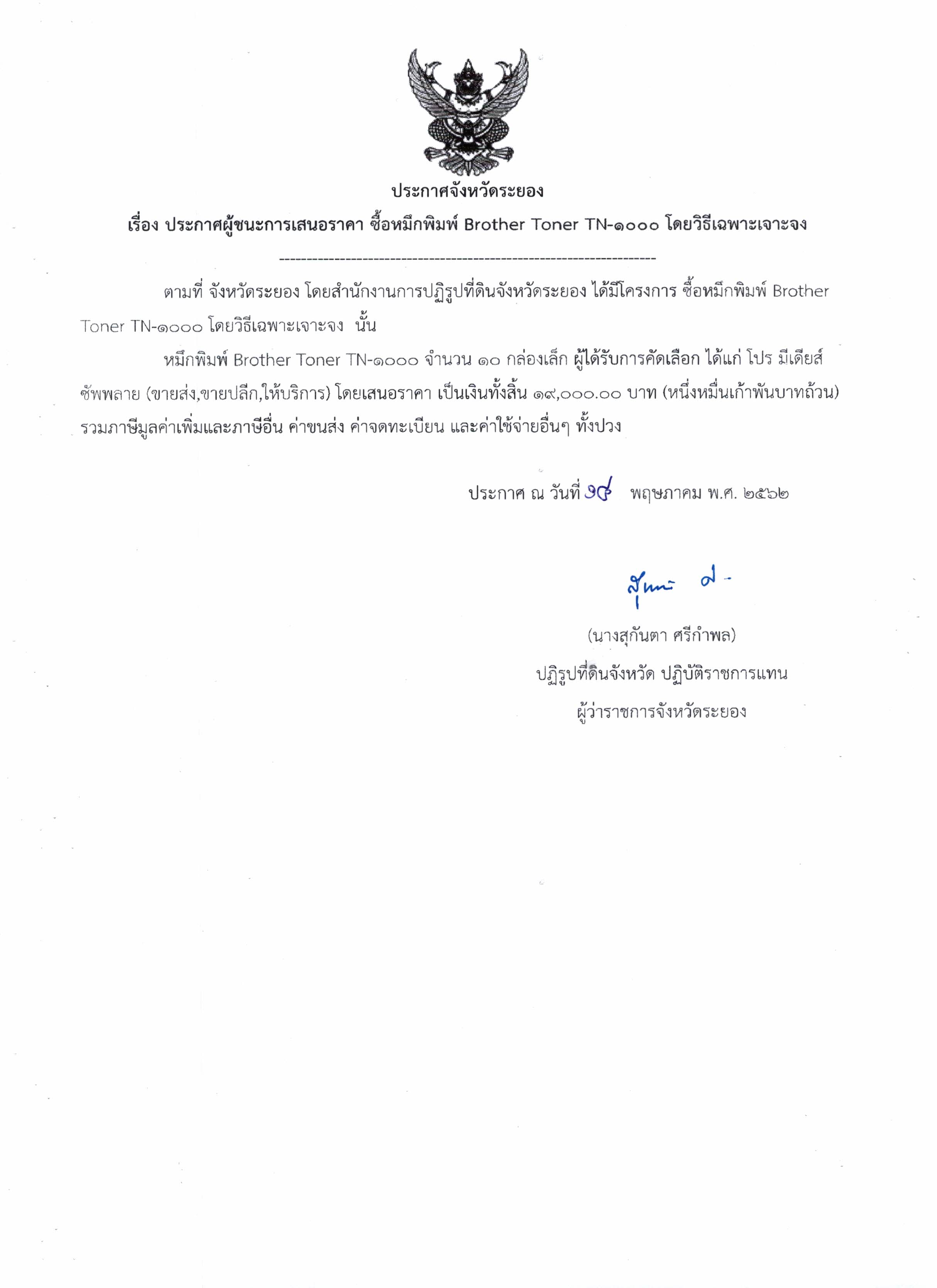 ประกาศจังหวัดระยอง เรื่อง ประกาศผู้ชนะการเสนอราคา ซื้อหมึกพิมพ์ Brother Toner TN-1000 โดยวิธีเฉพาะเฉพาะเจาะจง