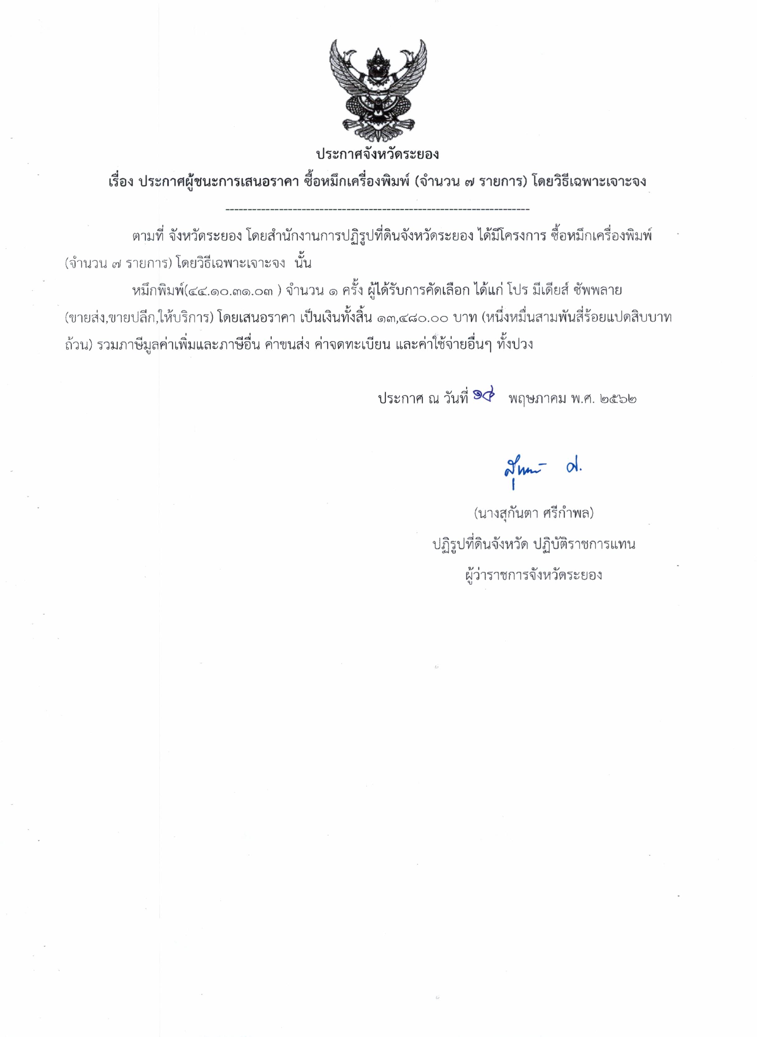 ประกาศจังหวัดระยอง เรื่อง ประกาศผู้ชนะการเสนอราคา ซื้อหมึกเครื่องพิมพ์ (จำนวน 7 รายการ) โดยวิธีเฉพาะเจาะจง