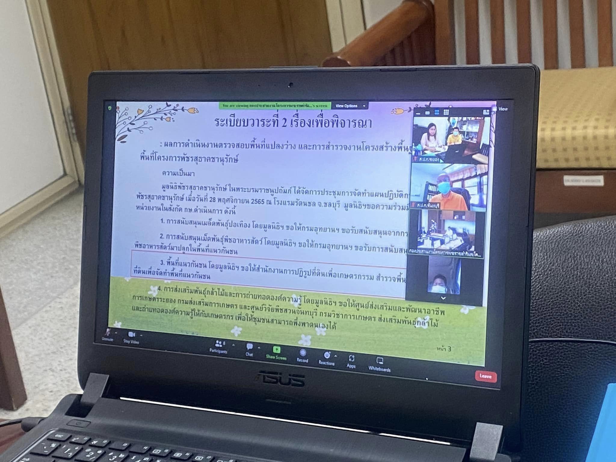 วันพฤหัสบดีที่ 16 มีนาคม 2566 นางวิไลกัลยา สาริพันธ์ ปฏิรูปที่ดินจังหวัดระยอง พร้อมด้วยเจ้าหน้าที่ปฏิรูปที่ดินจังหวัดระยอง ร่วมประชุมติดตามความก้าวหน้าการดำเนินงานโครงการพัชรสุธาคชานุรักษ์ พ.ศ.2566 ในพื้นที่ ส.ป.ก. 5 จังหวัดในภาคตะวันออก ได้แก่ จังหวัดฉะเชิงเทรา ชลบุรี ระยอง สระแก้ว และจันทบุรี ผ่านระบบประชุมออนไลน์ ณ ห้องสำนักงานการปฏิรูปที่ดินจังหวัดระยอง โดยมีนายวุฒิพงศ์ เนียมหอมรองเลขาธิการ ส.ป.ก. เป็นประธานในการประชุมฯ