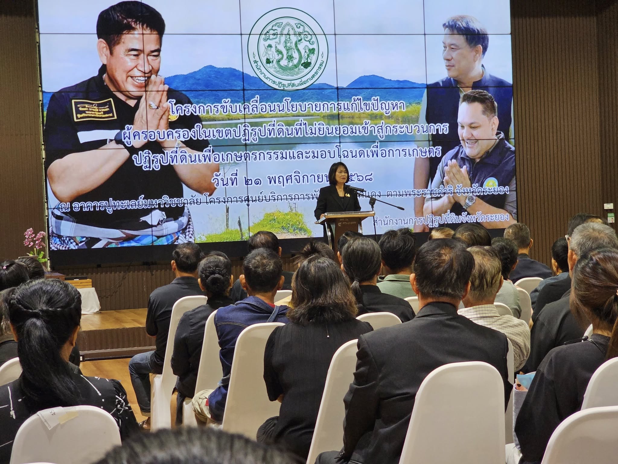 วันที่ 21 พฤศจิกายน 2568 ณ โครงการศูนย์บริการการพัฒนาปลวกแดงตามพระราชดำริ จังหวัดระยอง (เมืองพระมหาชนก) อำเภอปลวกแดง จังหวัดระยอง นางสาวสลารีวรรณ ทัพทวี รองผู้ว่าราชการจังหวัดระยอง เป็นประธานพร้อมด้วย นายสกนธ์ กรกฎ นายอำเภอปลวกแดง นางวิไลกัลยา สาริพันธ์ ปฏิรูปที่ดินจังหวัดระยอง นายธนโชค พงษ์ชวลิต เกษตรและสหกรณ์จังหวัดระยอง และหน่วยงานที่เกี่ยวข้อง ร่วมพิธีเปิดงาน “โครงการขับเคลื่อนนโยบายการแก้ไขปัญหาผู้ครอบครองในเขตปฏิรูปที่ดินที่ไม่ยินยอมเข้าสู่กระบวนการปฏิรูปที่ดินเพื่อเกษตรกรรมและมอบโฉนดเพื่อการเกษตร” ณ อาคารปูทะเลย์มหาวิชชาลัย โดยมีนายธรรมนัส พรหมเผ่า รองนายกรัฐมนตรีและรัฐมนตรีว่าการกระทรวงเกษตรและสหกรณ์ เป็นประธานในพิธี ผ่านระบบวีดิทัศน์ทางไกลจากจังหวัดราชบุรี ถ่ายทอดพร้อมกันทั่วประเทศ 75 จังหวัด