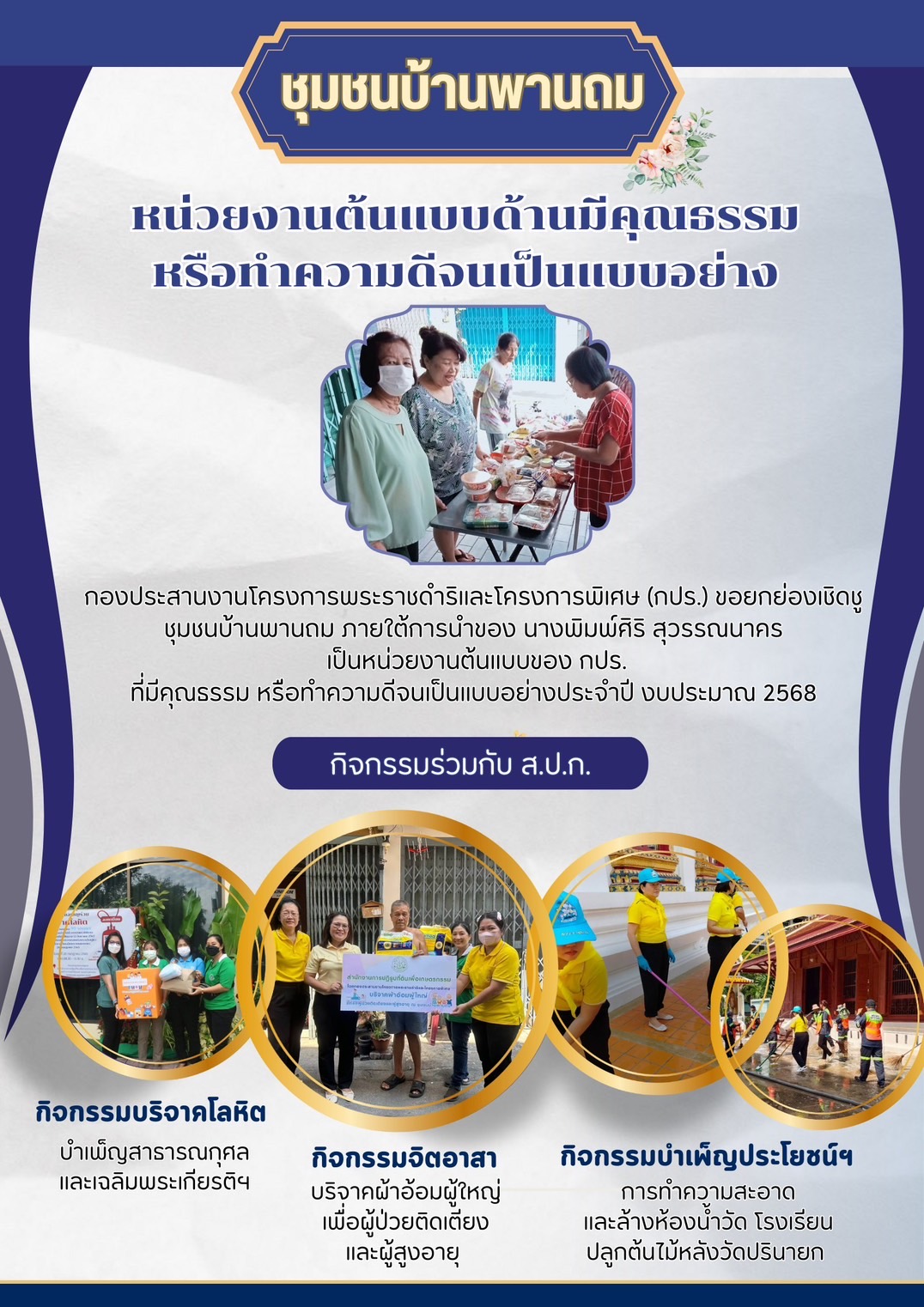 ได้แก่ ชุมชนบ้านพานถม ภายใต้การนำของ นางพิมพ์ศิริ สุวรรณนาคร เป็นหน่วยงานต้นแบบของ กปร.