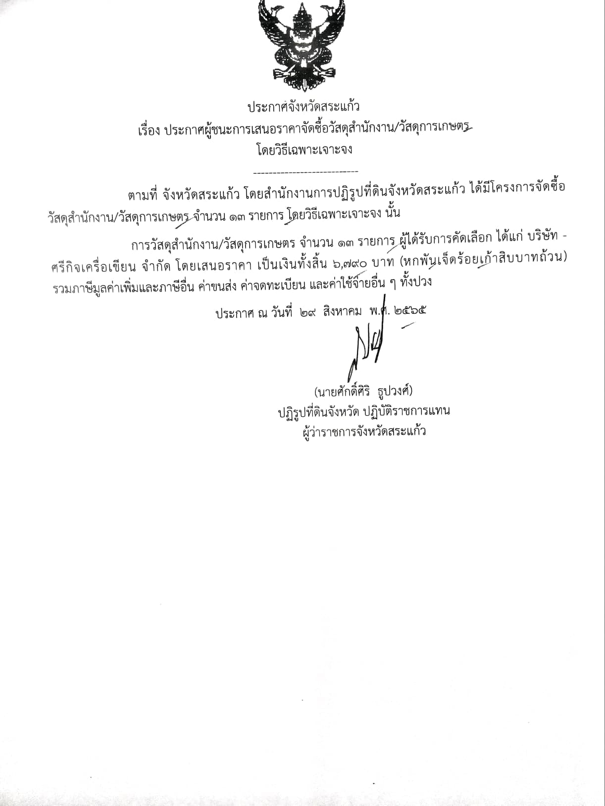 ประกาศจังหวัดสระแก้ว เรื่อง ประกาศผู้ชนะการเสนอราคาจัดซื้อวัสดุสำนักงาน /วัสดุการเกษตร โดยวิธีเฉพาะเจาะจง
