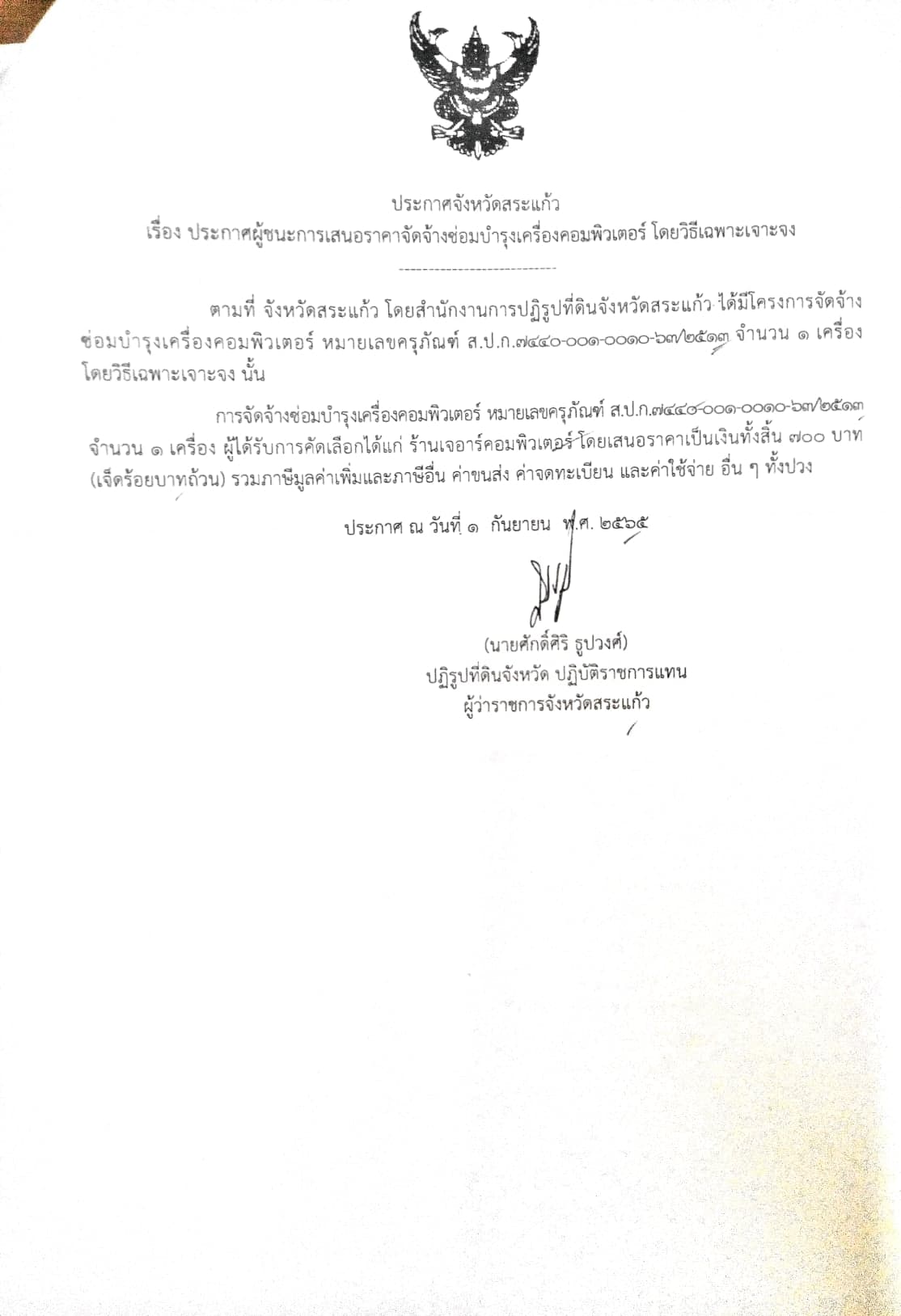 ประกาศจังหวัดสระแก้ว เรื่อง ประกาศผู้ชนะการเสนอราคาจัดจ้างซ่อมบำรุงเครื่องคอมพิวเตอร์ โดยวิธีเฉพาะเจาะจง