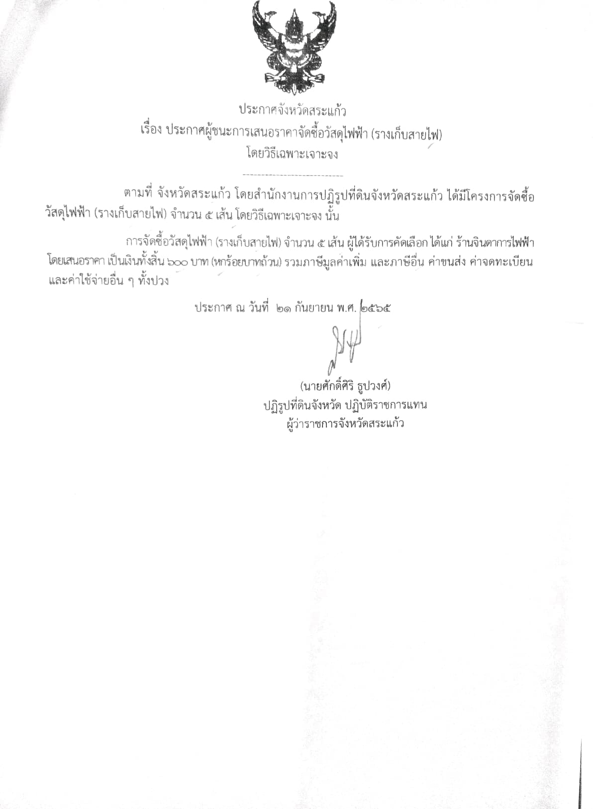 ประกาศจังหวัดสระแก้ว เรื่อง ประกาศผู้ชนะการเสนอราคาจัดซื้อวัสดุไฟฟ้า (รางเก็บสายไฟ) โดยวิธีเฉพาะเจาะจง