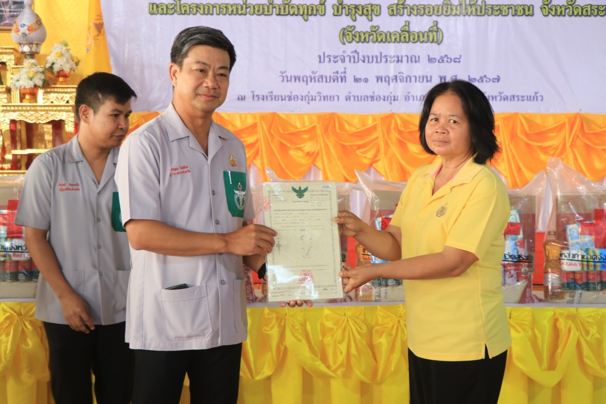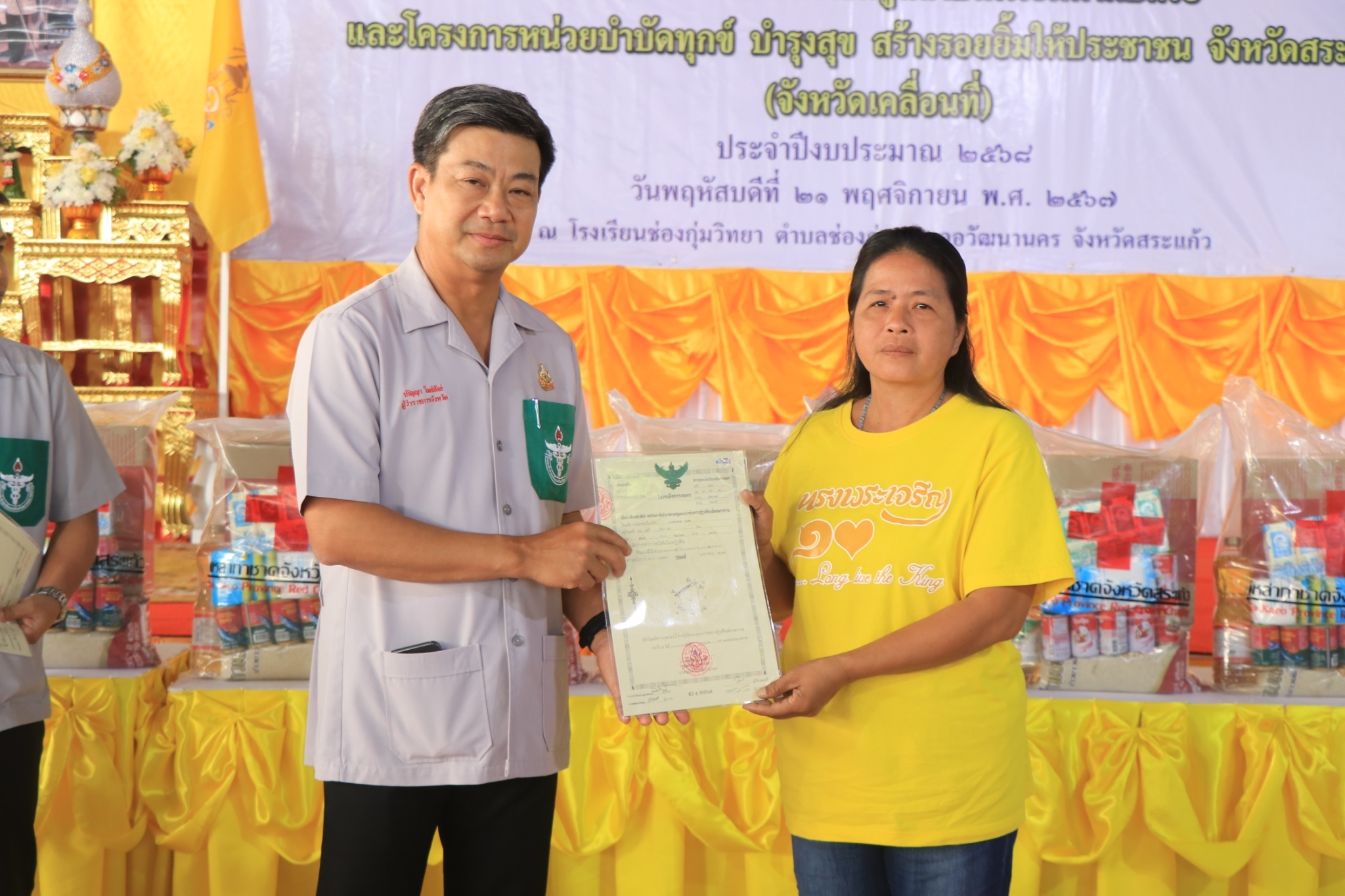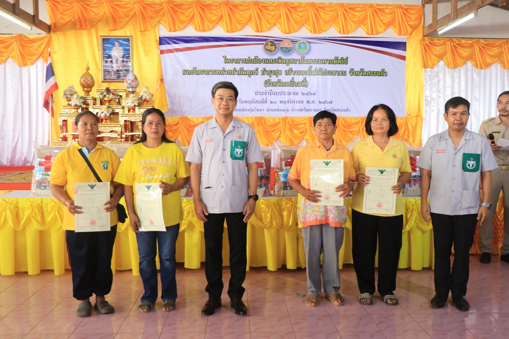 วันพฤหัสบดีที่ 21 พฤศจิกายน พ.ศ. 2567 สำนักงานการปฏิรูปที่ดินจังหวัดสระแก้ว ส.ป.ก.สระแก้ว ได้ร่วมดำเนินกิจกรรมกิจกรรมปกป้องและเชิดชูสถาบันพระมหากษัตริย์ และ โครงการ “หน่วยบำบัดทุกข์ บำรุงสุข สร้างรอยยิ้มให้กับประชาชน ณ โรงเรียนช่องกุ่มวิทยา หมู่ที่ 1 ตำบลช่องกุ่ม อำเภอวัฒนานคร จังหวัดสระแก้ว โดยมีนายปริญญา โพธิสัตย์ ผู้ว่าราชการจังหวัดสระแก้ว นายเชาวเนตร ยิ้มประเสริฐ และ นายภูมิวัชร์ อุดมทรัพย์ รองผู้ว่าราชการจังหวัดสระแก้ว พร้อมด้วยหัวหน้าส่วนราชการ และ หน่วยงานราชการ เอกชน ซึ่งกิจกรรมนี้เป็นการออกหน่วยบริการของส่วนราชการ โดยมีหัวหน้าส่วนราชการพร้อมให้คำตอบในการแก้ไขปัญหาในพื้นที่ พร้อมทั้งมีการให้บริการภายในงานกิจกรรมดังกล่าว ในส่วนของสำนักงานการปฏิรูปที่ดินจังหวัดสระแก้วได้จัดมอบโฉนดที่ดินให้แก่ตัวแทนเกษตรกร