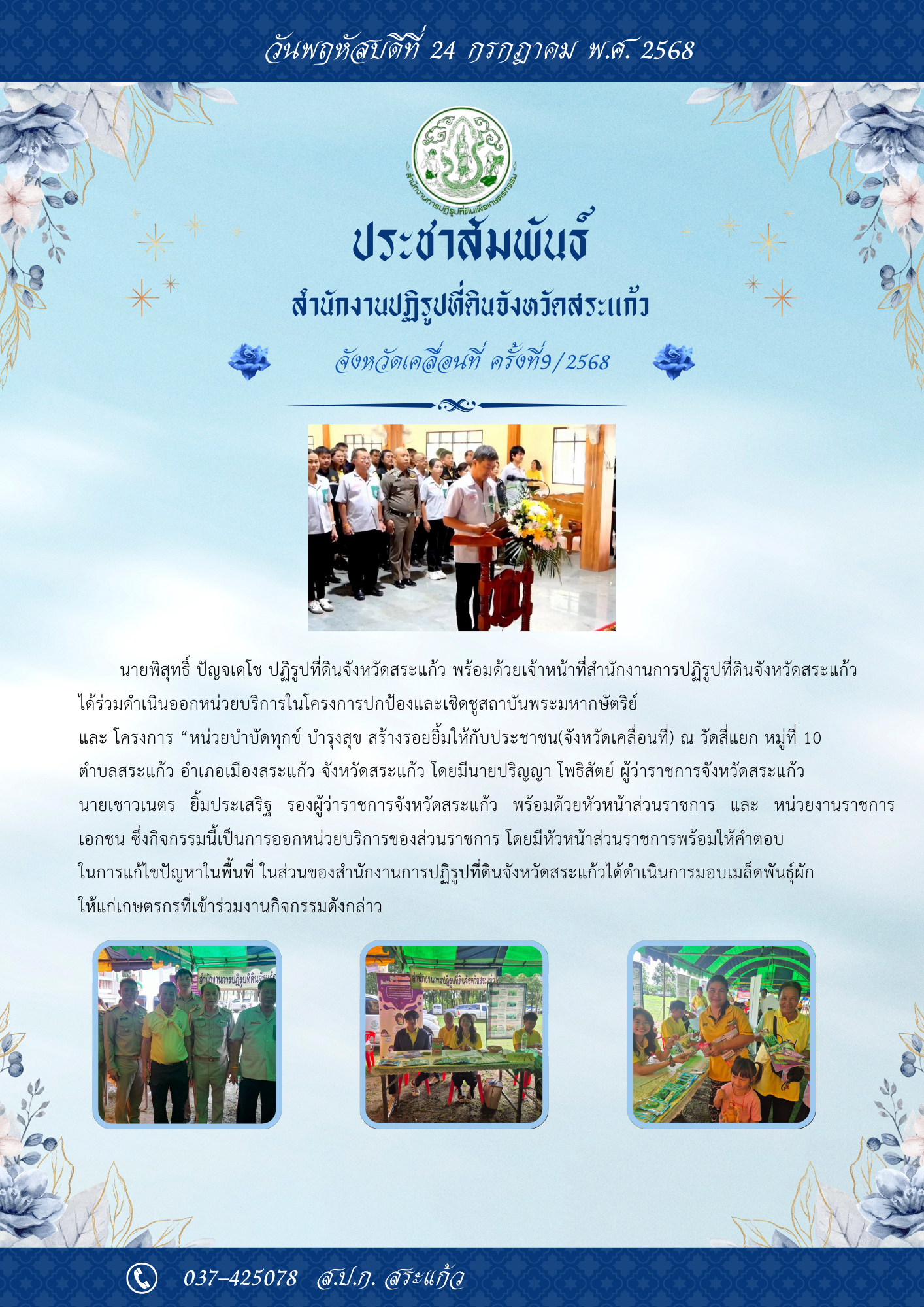 โครงการปกป้องและเชิดชูสถาบันพระมหากษัตริย์ และโครงการหน่วยบำบัดทุกข์ บำรุงสุขสร้างรอยยิ้มให้ประชาชน จังหวัดสระแก้ว (จังหวัดเคลื่อนที่) ประจำปีงบประมาณ พ.ศ. 2568 เดือนกันยายน 2568 ครั้งที่ 12/2568