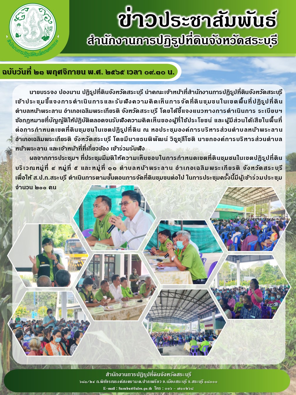 นายบรรจง ปองนาน ปฏิรูปที่ดินจังหวัดสระบุรี นำคณะเจ้าหน้าที่สำนักงานการปฏิรูปที่ดินจังหวัดสระบุรี เข้าประชุมชี้แจงการดำเนินการและรับฟังความคิดเห็นการจัดที่ดินชุมชนในเขตพื้นที่ปฏิรูปที่ดินตำบลหน้าพระลาน อำเภอเฉลิมพระเกียรติ จังหวัดสระบุรี โดยชี้แจงแนวทางการดำเนินการ ระเบียบฯ ข้อกฎหมายที่บัญญัติให้ปฏิบัติตลอดจนรับฟังความคิดเห็นของผู้ที่ใช้ประโยชน์ และผู้มีส่วนได้เสียในพื้นที่ต่อการกำหนดเขตที่ดินชุมชนในเขตปฏิรูปที่ดิน ณ หอประชุมองค์การบริหารส่วนตำบลหน้าพระลาน อำเภอเฉลิมพระเกียรติ จังหวัดสระบุรี โดยมีนายธนพิพัฒน์ วิธูชุลีโชติ นายกองค์การบริหารส่วนตำบลหน้าพระลาน และเจ้าหน้าที่ที่เกี่ยวข้อง เข้าร่วมรับฟัง