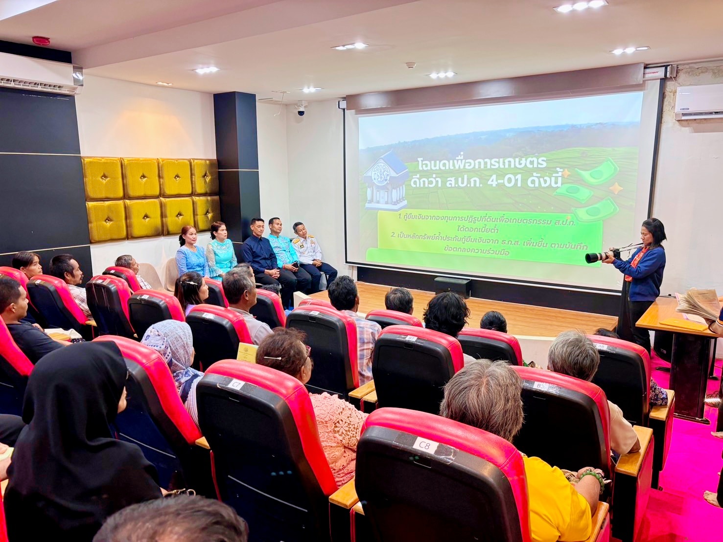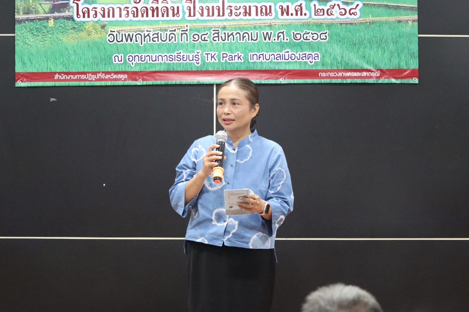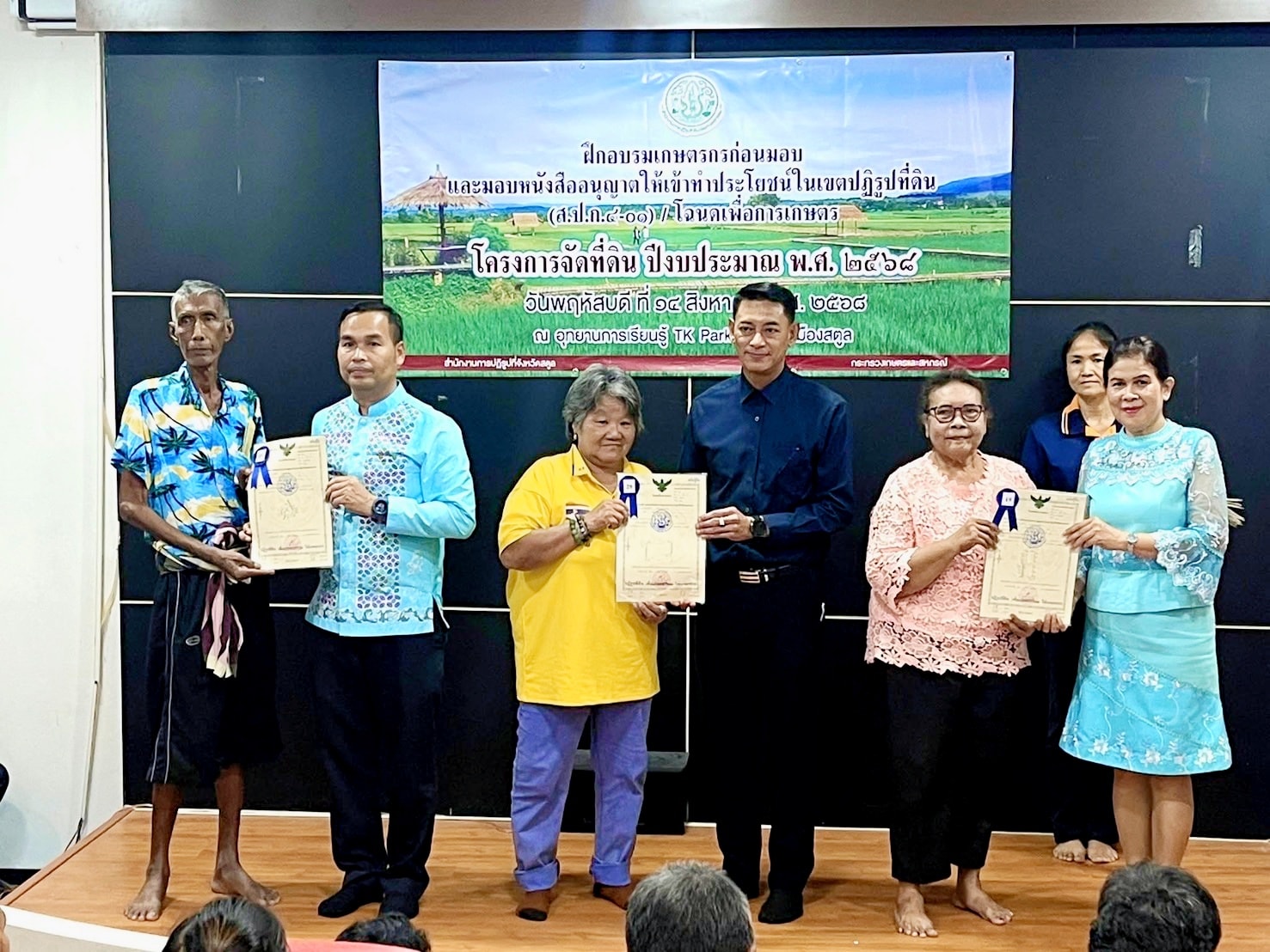 วันที่14 สิงหาคม 2568 เวลา 14.30 น.นางรัชดา เพชรรัตน์ ปฏิรูปที่ดินจังหวัดสตูล มอบหมายกลุ่มยุทธศาสตร์และการปฏิรูปที่ดิน จัดฝึกอบรมเกษตรกรก่อนมอบหนังสืออนุญาตให้เข้าทำประโยชน์ในเขตปฏิรูปที่ดิน (ส.ป.ก.4-01)และโฉนดเพื่อการเกษตร พร้อมให้ความรู้แก่เกษตรกร เกี่ยวกับสิทธิหน้าที่ของเกษตรกร การเพิ่มมูลค่าที่ดิน สิทธิประโยชน์จากส.ป.ก.4-01 และโฉนดเพื่อการเกษตร พร้อมมอบเอกสารสิทธิ์ให้แก่เกษตรกร จำนวน 46 ราย เนื้อที่ประมาณ 80 ไร่ โดยได้รับเกียรติจากนายณัฐวุฒิ บินตำมะหงง รองนายกเทศมนตรีเมืองสตูล เป็นประธานฯ นายนิพนธ์ เสนอินทร์ ประมงจังหวัดสตูล นางสาวดาวัล บัวงาม เกษตรและสหกรณ์จังหวัดสตูล นางสุภารัตน์ หาญศิริสวัสดิ์ ผู้อำนวยการสำนักงานตรวจบัญชีสหกรณ์สตูล และนายมิตร บุญจันทร์ ผู้อำนวยการโครงการชลประทานสตูล ร่วมมอบเอกสารสิทธิ์ ณ ห้อง Mini Theater อุทยานการเรียนรู้ TK Park เทศบาลเมืองสตูล อำเภอเมืองสตูล จังหวัดสตูล การมอบหนังสืออนุญาตให้เข้าทำประโยชน์ในเขตปฏิรูปที่ดิน (ส.ป.ก.4-01) และโฉนดเพื่อการการเกษตร เป็นประโยชน์ต่อการสร้างรายได้ ความมั่นคง และความเป็นอยู่ที่ดีขึ้นของเกษตรกรในพื้นที่ ทั้งยังเป็นการยกระดับและสร้างความมั่นคงในอาชีพเกษตรกรรม ตลอดจนเป็นการขับเคลื่อนนโยบายของรัฐบาลที่ต้องการให้เกษตรกรมีที่ดินทำกินที่ถูกต้องตามกฎหมาย และสามารถนำที่ดินไปพัฒนาคุณภาพชีวิตและสร้างความเข้มแข็งให้กับภาคเกษตรกรรมได้ต่อไป