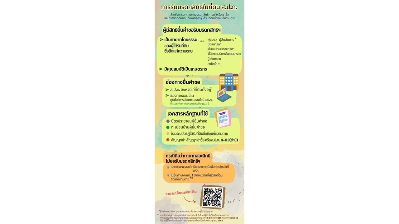 การรับมรดกสิทธิในที่ดิน ส.ป.ก. สำหรับการตกทอดทางมรดกสิทธิการเช่าหรือเช่าซื้อและการจัดที่ดินแทนที่เกษตรกรผู้ได้รับที่ดินซึ่งถึงแก่ความตาย