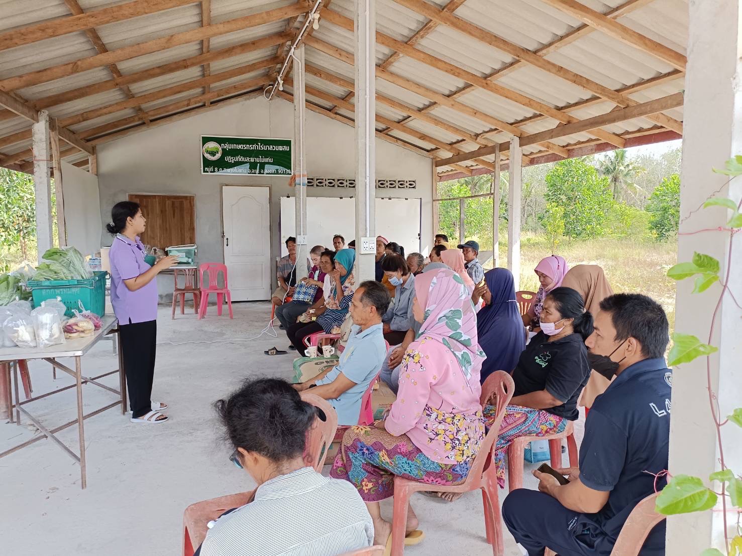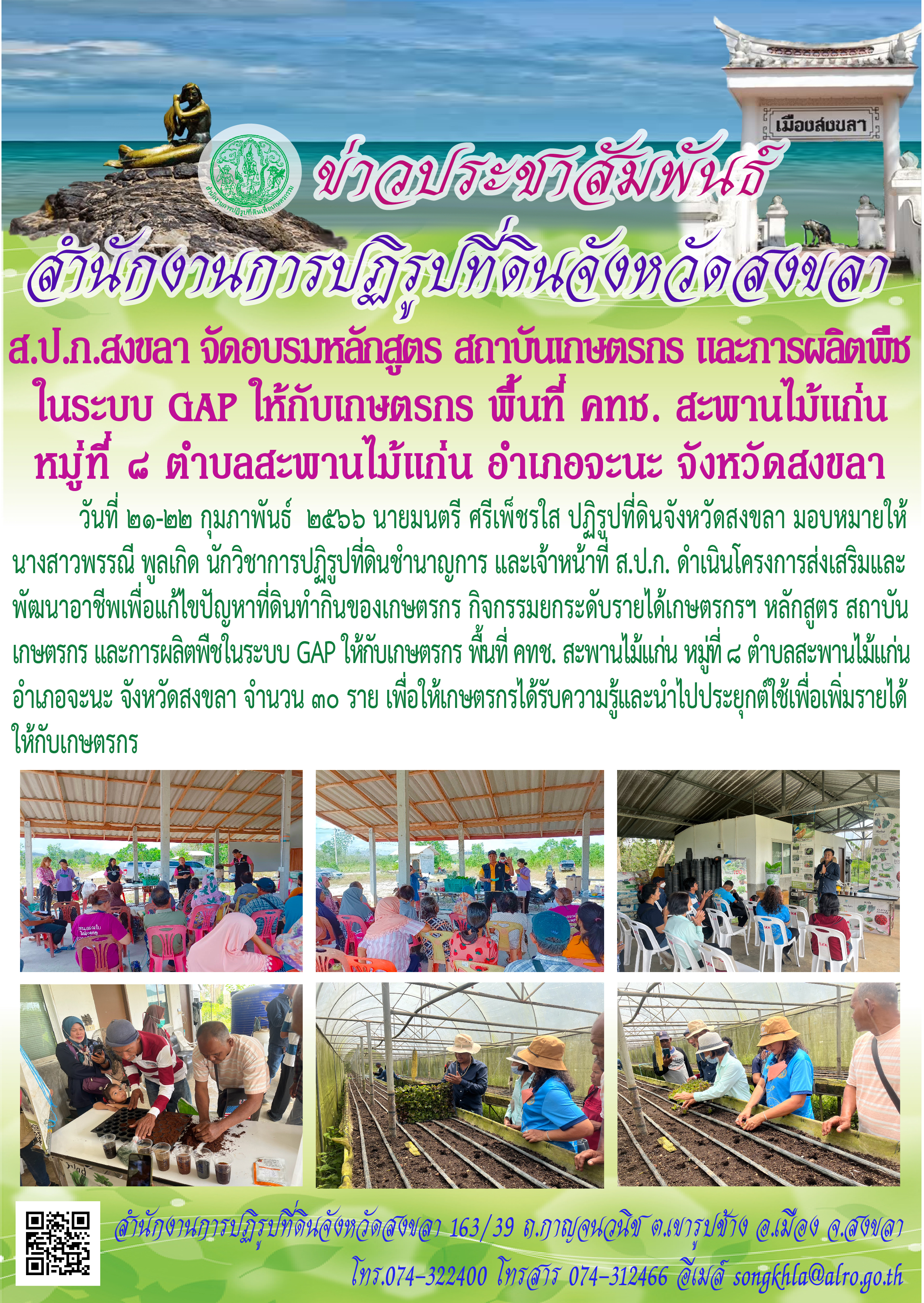 วันที่ ๒๑-๒๒ กุมภาพันธ์ ๒๕๖๖ นายมนตรี ศรีเพ็ชรใส ปฏิรูปที่ดินจังหวัดสงขลา มอบหมายให้ นางสาวพรรณี พูลเกิด นักวิชาการปฏิรูปที่ดินชำนาญการ และเจ้าหน้าที่ ส.ป.ก. ดำเนินโครงการส่งเสริมและพัฒนาอาชีพเพื่อแก้ไขปัญหาที่ดินทำกินของเกษตรกร กิจกรรมยกระดับรายได้เกษตรกรฯ หลักสูตร สถาบันเกษตรกร และการผลิตพืชในระบบ GAP ให้กับเกษตรกร พื้นที่ คทช. สะพานไม้แก่น หมู่ที่ ๘ ตำบลสะพานไม้แก่น อำเภอจะนะ จังหวัดสงขลา จำนวน ๓๐ ราย เพื่อให้เกษตรกรได้รับความรู้และนำไปประยุกต์ใช้เพื่อเพิ่มรายได้ให้กับเกษตรกร