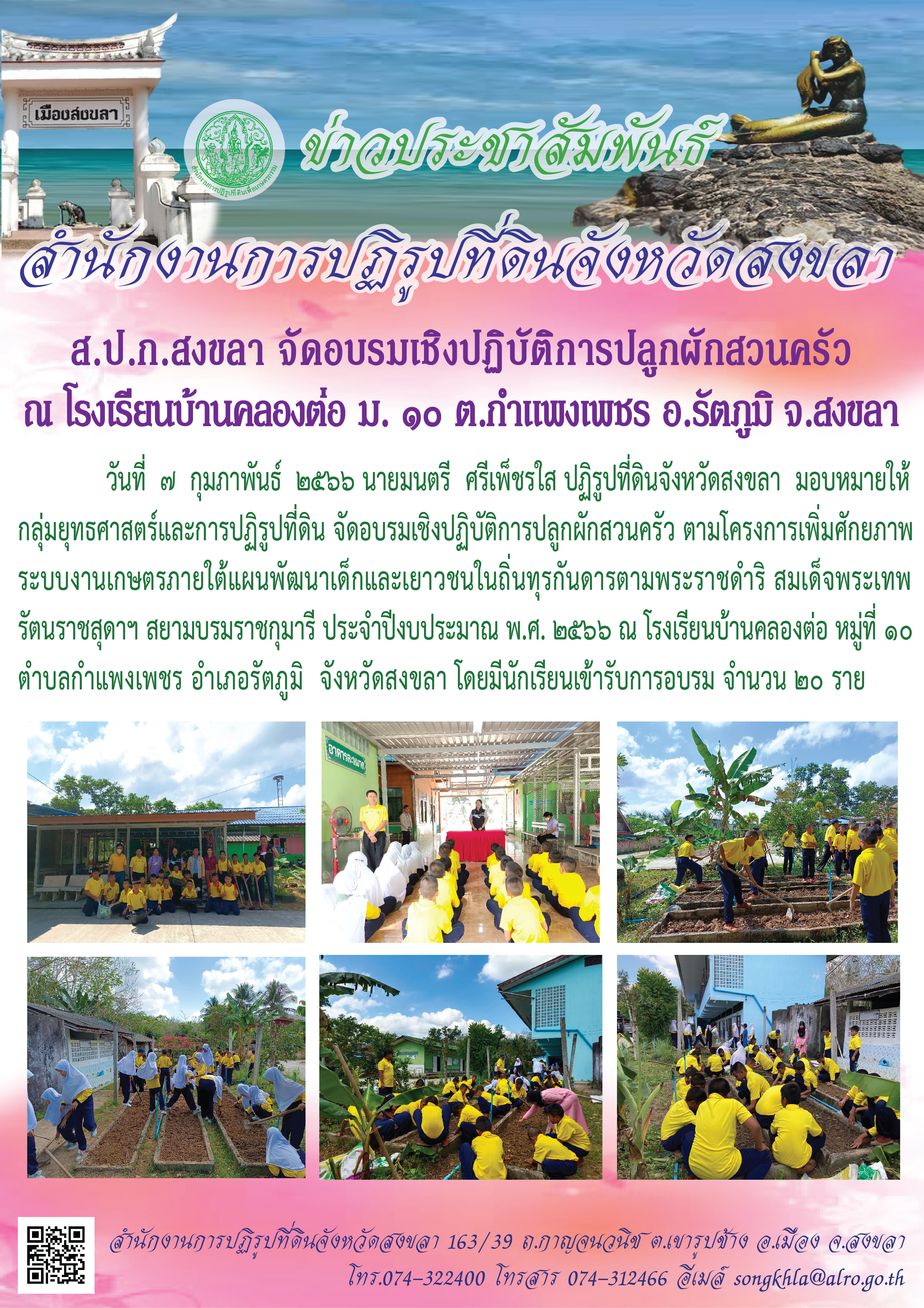 วันที่ ๗ กุมภาพันธ์ ๒๕๖๖ นายมนตรี ศรีเพ็ชรใส ปฏิรูปที่ดินจังหวัดสงขลา มอบหมายให้กลุ่มยุทธศาสตร์และการปฏิรูปที่ดิน จัดอบรมเชิงปฏิบัติการปลูกผักสวนครัว ตามโครงการเพิ่มศักยภาพระบบงานเกษตรภายใต้แผนพัฒนาเด็กและเยาวชนในถิ่นทุรกันดารตามพระราชดำริ สมเด็จพระเทพรัตนราชสุดาฯ สยามบรมราชกุมารี ประจำปีงบประมาณ พ.ศ. ๒๕๖๖ ณ โรงเรียนบ้านคลองต่อ หมู่ที่ ๑๐ ตำบลกำแพงเพชร อำเภอรัตภูมิ จังหวัดสงขลา โดยมีนักเรียนเข้ารับการอบรม จำนวน ๒๐ ราย