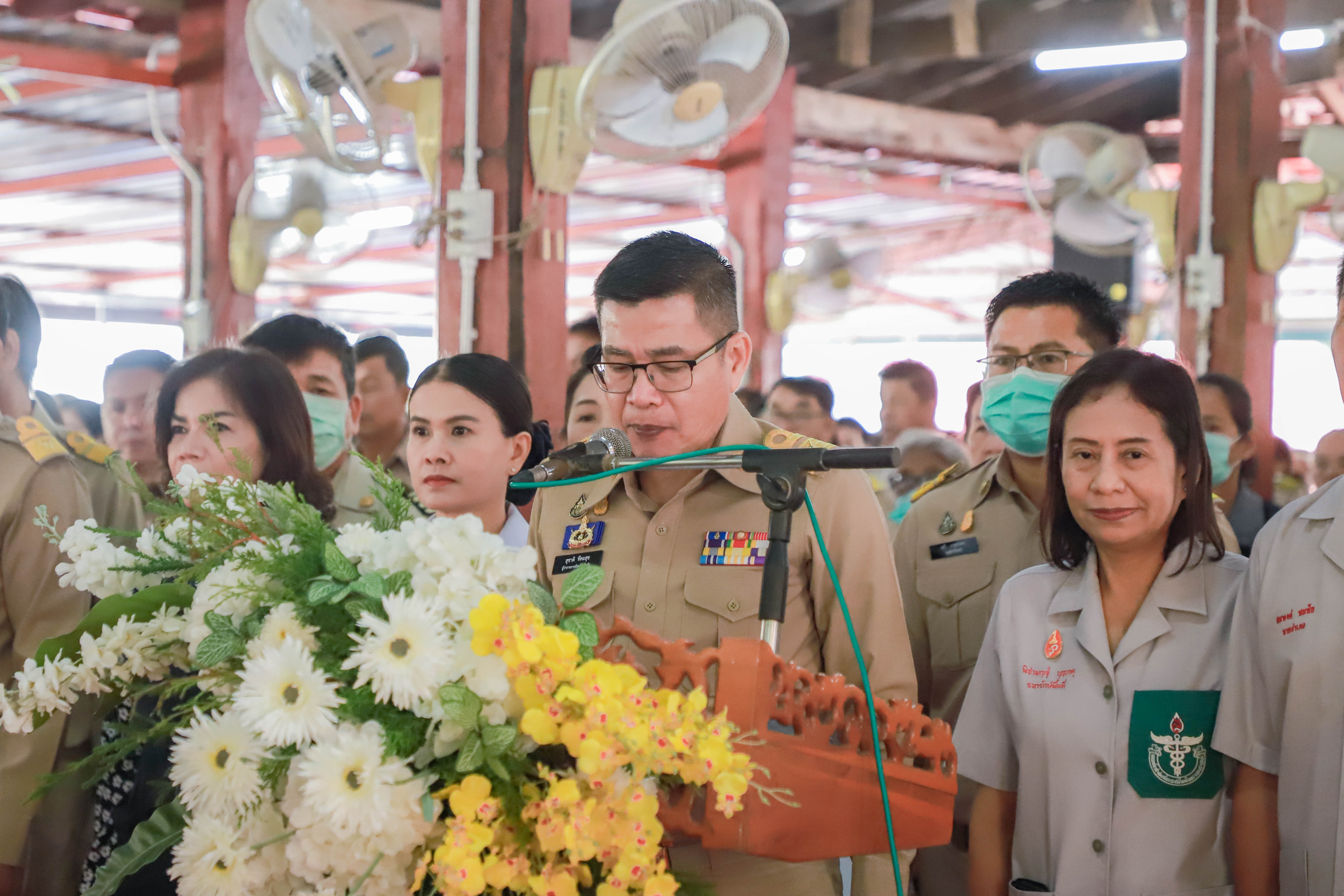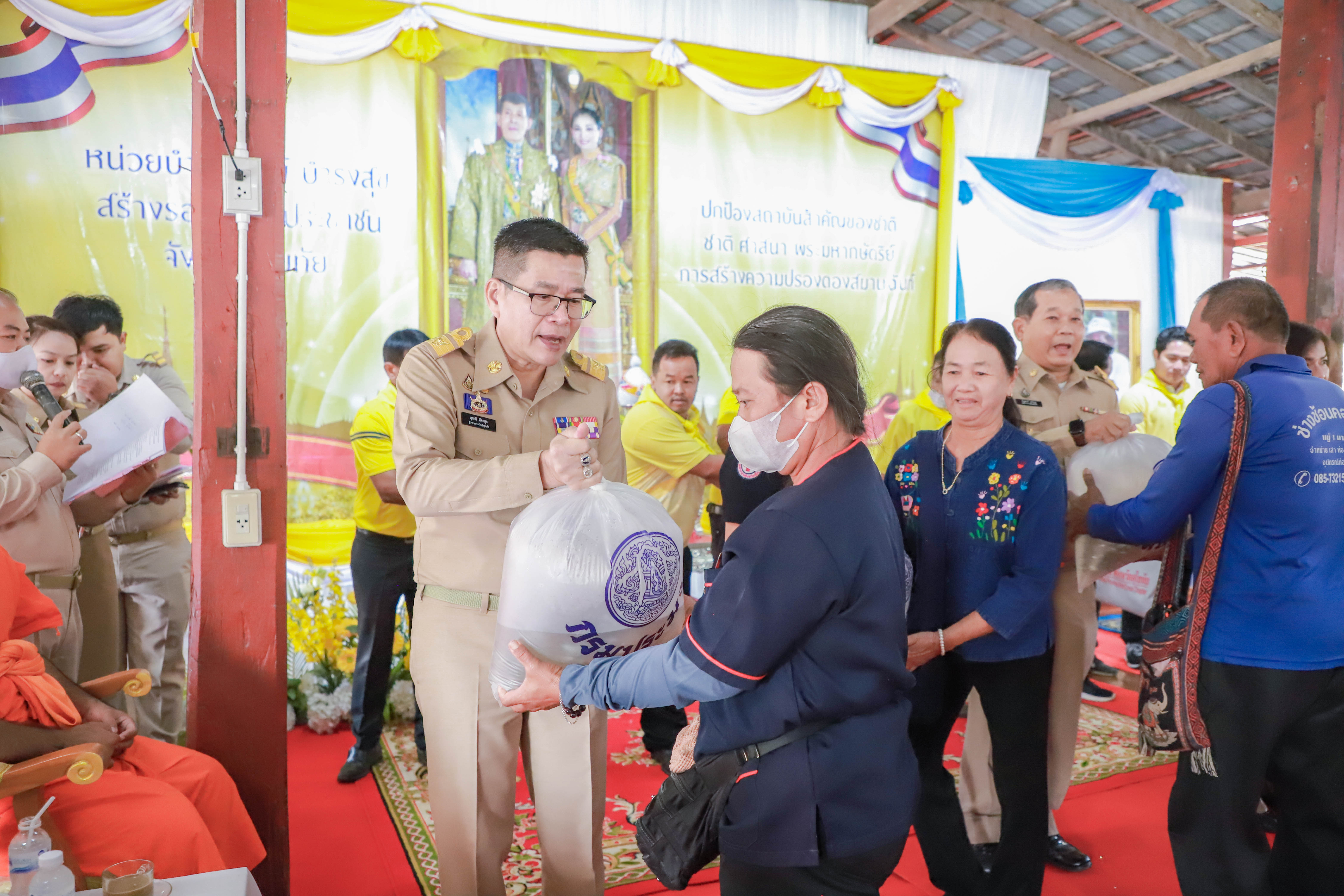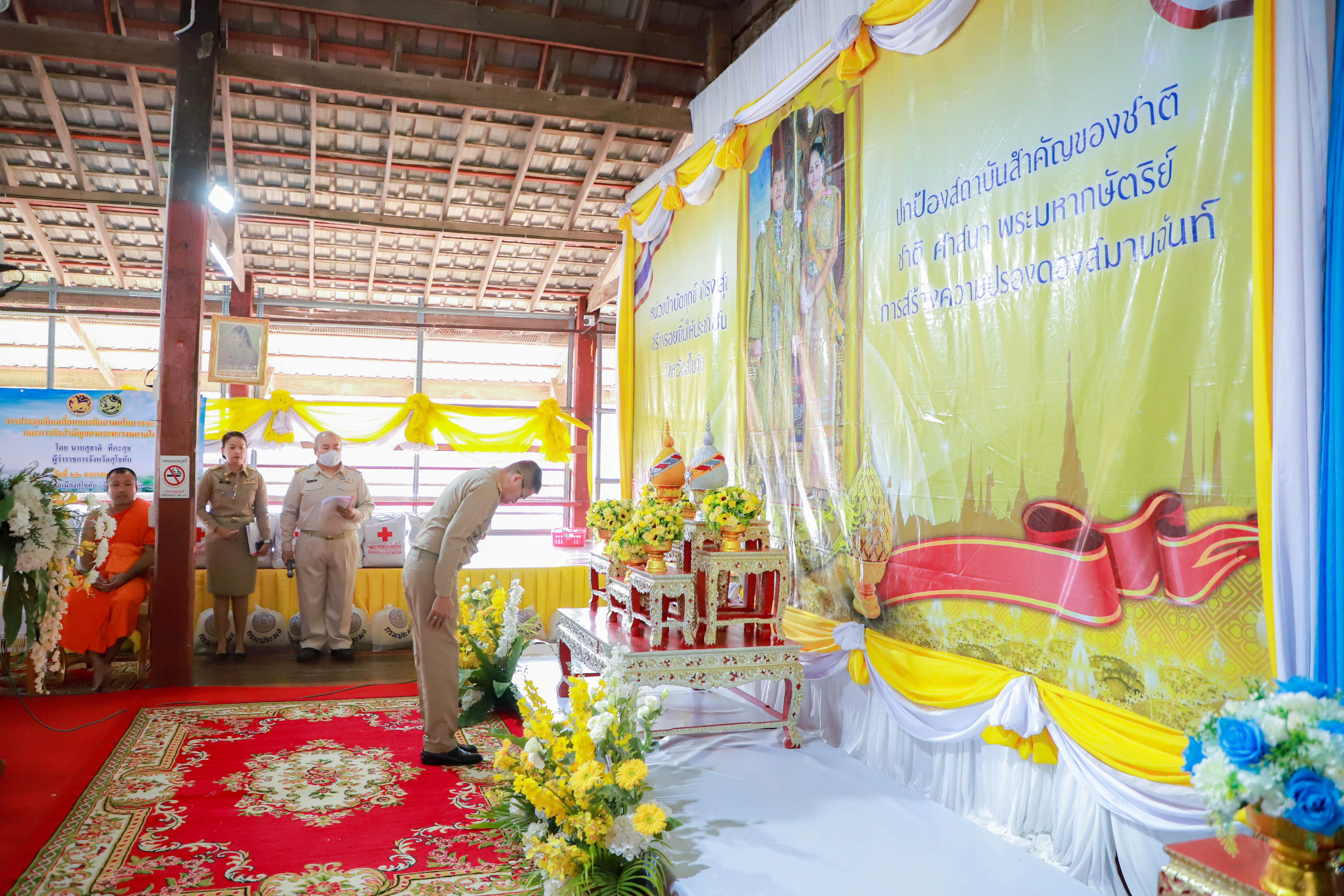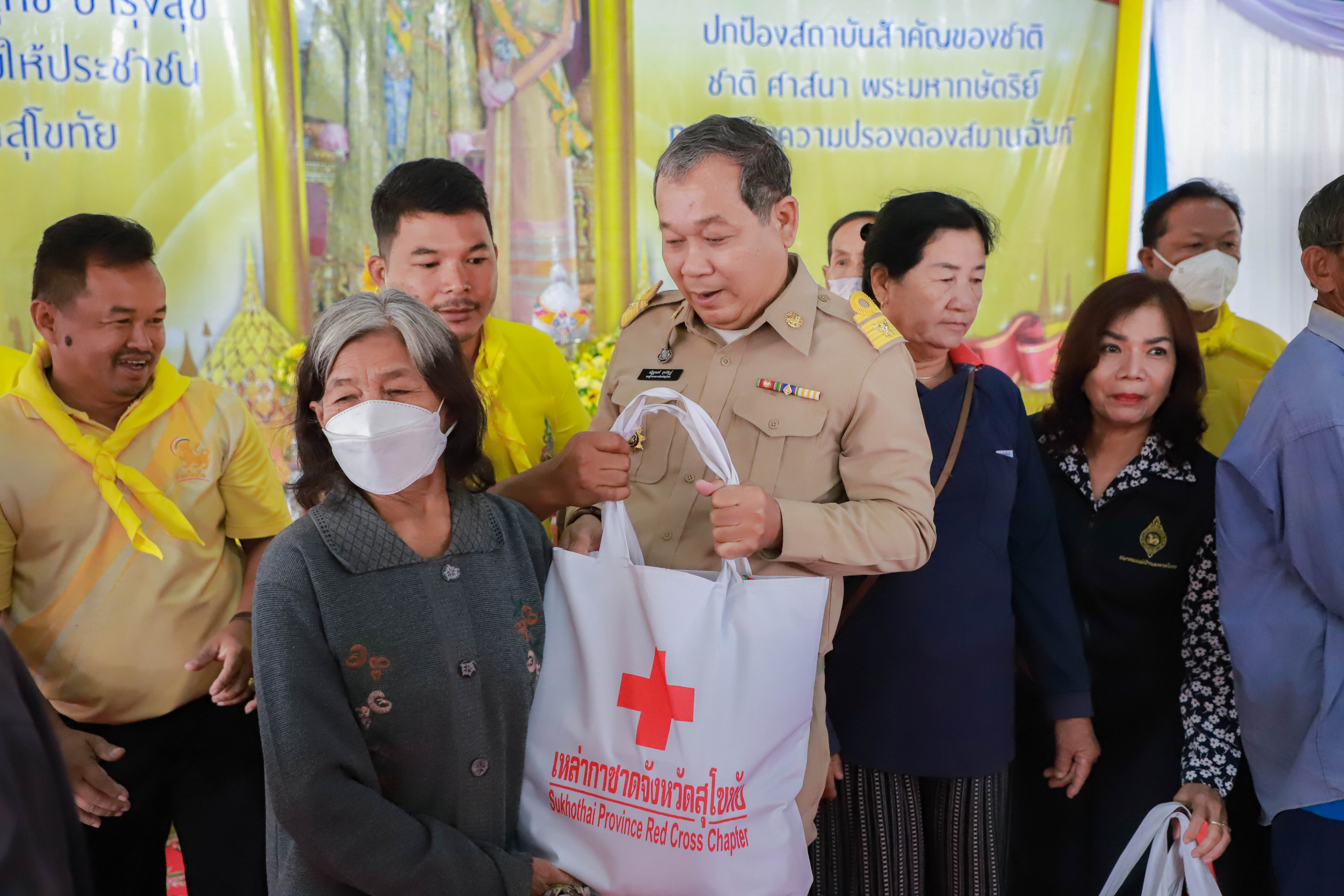 วันที่ 23 มกราคม 2567 เวลา 08.30 น. นายสุชาติ ทีคะสุข ผู้ว่าราชการจังหวัดสุโขทัย เป็นประธานในพิธีปกป้องสถาบันสำคัญของชาติ เพื่อเสริมสร้างความสมานฉันท์ โครงการหน่วยบำบัดทุกข์ บำรุงสุข สร้างรอยยิ้มให้ประชาชนจังหวัดสุโขทัย หน่วยแพทย์เคลื่อนที่ พอ.สว. จังหวัดสุโขทัย และโครงการคลินิคเกษตรเคลื่อนที่ในพระราชานุเคราะห์ พร้อมนำทุกภาคส่วนถวายสัตย์ปฏิญาณเบื้องหน้าพระบรมฉายาลักษณ์ พระบาทสมเด็จพระเจ้าอยู่หัว และสมเด็จพระนางเจ้า ฯ พระบรมราชินี และพระฉายาลักษณ์ สมเด็จพระเจ้าพี่นางเธอ เจ้าฟ้ากัลยาณิวัฒนา กรมหลวงนราธิวาสราชนครินทร์ โดยมีนางพร้อมจันทร์ ทีคะสุข รองนายกเหล่ากาชาดจังหวัดสุโขทัย นายณัฏฐพงศ์ สุขวิสิฏฐ์ รองผู้ว่าราชการจังหวัดสุโขทัย นางสาวสรินรัตน์ เกิดสกุลรุ่งโรจน์ รองผู้ว่าราชการจังหวัดสุโขทัย นายสมพงค์ ชมชัย นายอำเภอเมืองสุโขทัย ทหาร ตำรวจ สมาชิกเหล่ากาชาด หัวหน้าส่วนราชการ หน่วยงานรัฐวิสาหกิจ องค์กรปกครองส่วนท้องถิ่น กำนัน ผู้ใหญ่บ้าน และประชาชนในพื้นที่เข้าร่วมในกิจกรรม ณ วัดไสยาศน์ หมู่ที่ 2 ตำบลวังทองแดง อำเภอเมืองสุโขทัย จังหวัดสุโขทัย