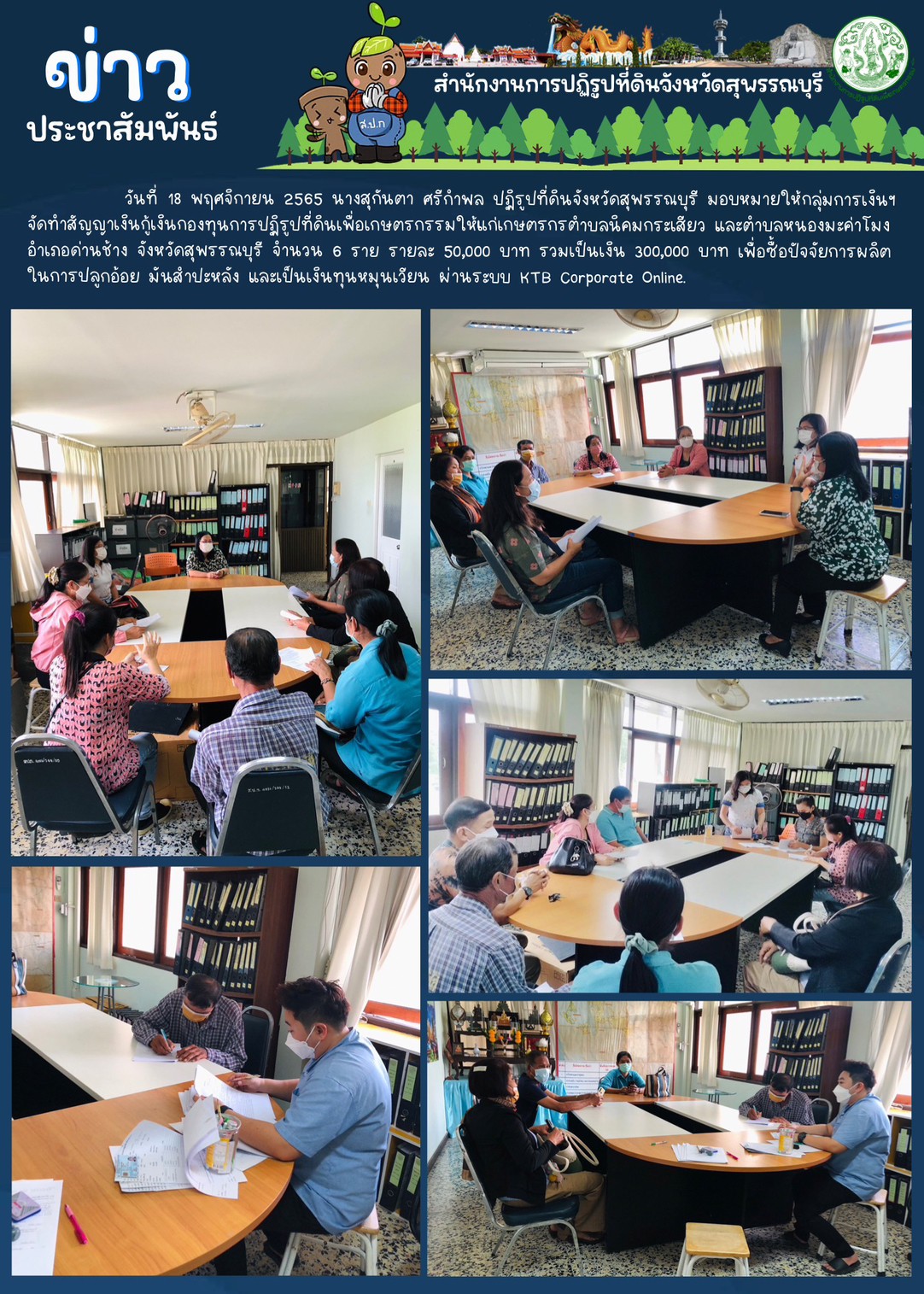 วันที่ 18 พฤศจิกายน 2565 นางสุกันตา ศรีกำพล ปฏิรูปที่ดินจังหวัดสุพรรณบุรี มอบหมายให้กลุ่มการเงินฯ จัดทำสัญญาเงินกู้เงินกองทุนการปฏิรูปที่ดินเพื่อเกษตรกรรมให้แก่เกษตรกรตำบลนิคมกระเสียว และตำบลหนองมะค่าโมง อำเภอด่านช้าง จังหวัดสุพรรณบุรี จำนวน 6 ราย รายละ 50,000 บาท รวมเป็นเงิน 300,000 บาท เพื่อซื้อปัจจัยการผลิตในการปลูกอ้อย มันสำปะหลัง และเป็นเงินทุนหมุนเวียน ผ่านระบบ KTB Corporate Online.