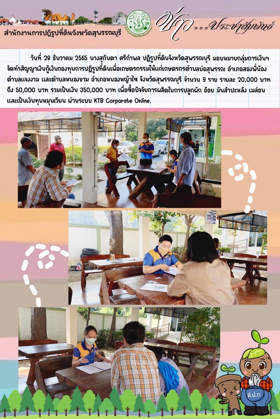 วันที่ 28 ธันวาคม 2565 นางสุกันตา ศรีกำพล ปฏิรูปที่ดินจังหวัดสุพรรณบุรี มอบหมายกลุ่มการเงินฯ จัดทำสัญญาเงินกู้เงินกองทุนการปฏิรูปที่ดินเพื่อเกษตรกรรมให้แก่เกษตรกรตำบลบ่อสุพรรณ อำเภอสองพี่น้อง ตำบลแจงงาม และตำบลหนองขาม อำเภอหนองหญ้าไซ จังหวัดสุพรรณบุรี จำนวน 9 ราย รายละ 20,000 บาท ถึง 50,000 บาท รวมเป็นเงิน 350,000 บาท เพื่อซื้อปัจจัยการผลิตในการปลูกผัก อ้อย มันสำปะหลัง เมล่อนและเป็นเงินทุนหมุนเวียน ผ่านระบบ KTB Corporate Online.