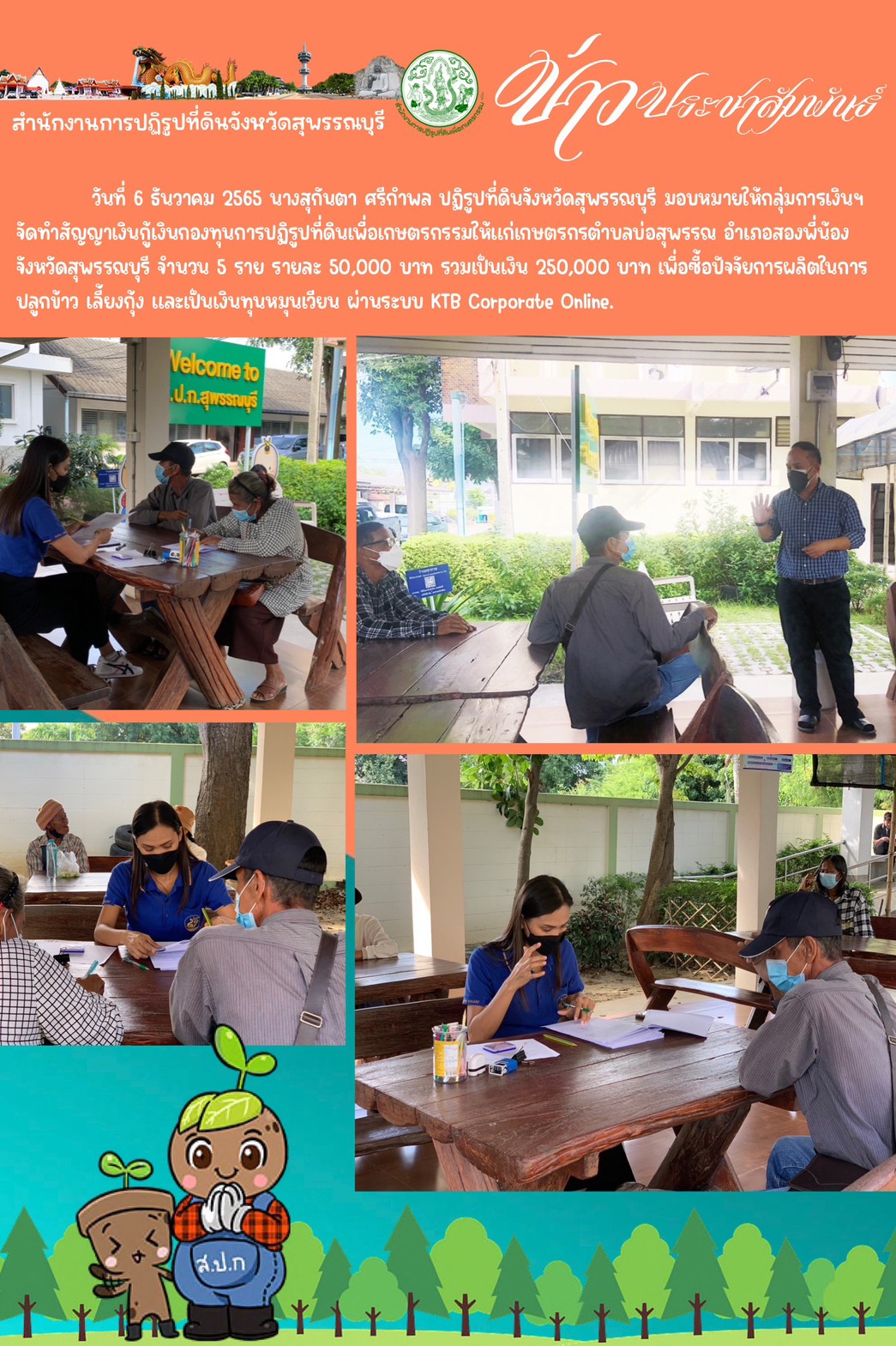 วันที่ 6 ธันวาคม 2565 นางสุกันตา ศรีกำพล ปฏิรูปที่ดินจังหวัดสุพรรณบุรี มอบหมายให้กลุ่มการเงินฯ จัดทำสัญญาเงินกู้เงินกองทุนการปฏิรูปที่ดินเพื่อเกษตรกรรมให้แก่เกษตรกรตำบลบ่อสุพรรณ อำเภอสองพี่น้อง จังหวัดสุพรรณบุรี จำนวน 5 ราย รายละ 50,000 บาท รวมเป็นเงิน 250,000 บาท เพื่อซื้อปัจจัยการผลิตในการปลูกข้าว เลี้ยงกุ้ง และเป็นเงินทุนหมุนเวียน ผ่านระบบ KTB Corporate Online.