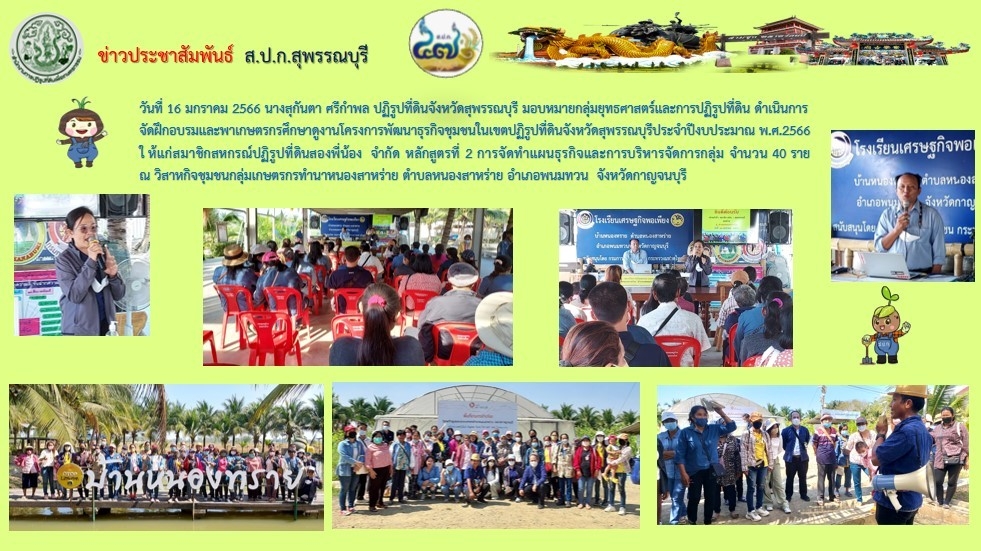 วันที่ 16 มกราคม 2566 นางสุกันตา ศรีกำพล ปฏิรูปที่ดินจังหวัดสุพรรณบุรี มอบหมายกลุ่มยุทธศาสตร์และการปฏิรูปที่ดิน ดำเนินการจัดฝึกอบรมและพาเกษตรกรศึกษาดูงานโครงการพัฒนาธุรกิจชุมชนในเขตปฏิรูปที่ดินจังหวัดสุพรรณบุรีประจำปีงบประมาณ พ.ศ.2566 ให้แก่สมาชิกสหกรณ์ปฏิรูปที่ดินสองพี่น้อง จำกัด หลักสูตรที่ 2 การจัดทำแผนธุรกิจและการบริหารจัดการกลุ่ม จำนวน 40 ราย ณ วิสาหกิจชุมชนกลุ่มเกษตรกรทำนาหนองสาหร่าย ตำบลหนองสาหร่าย อำเภอพนมทวน จังหวัดกาญจนบุรี
