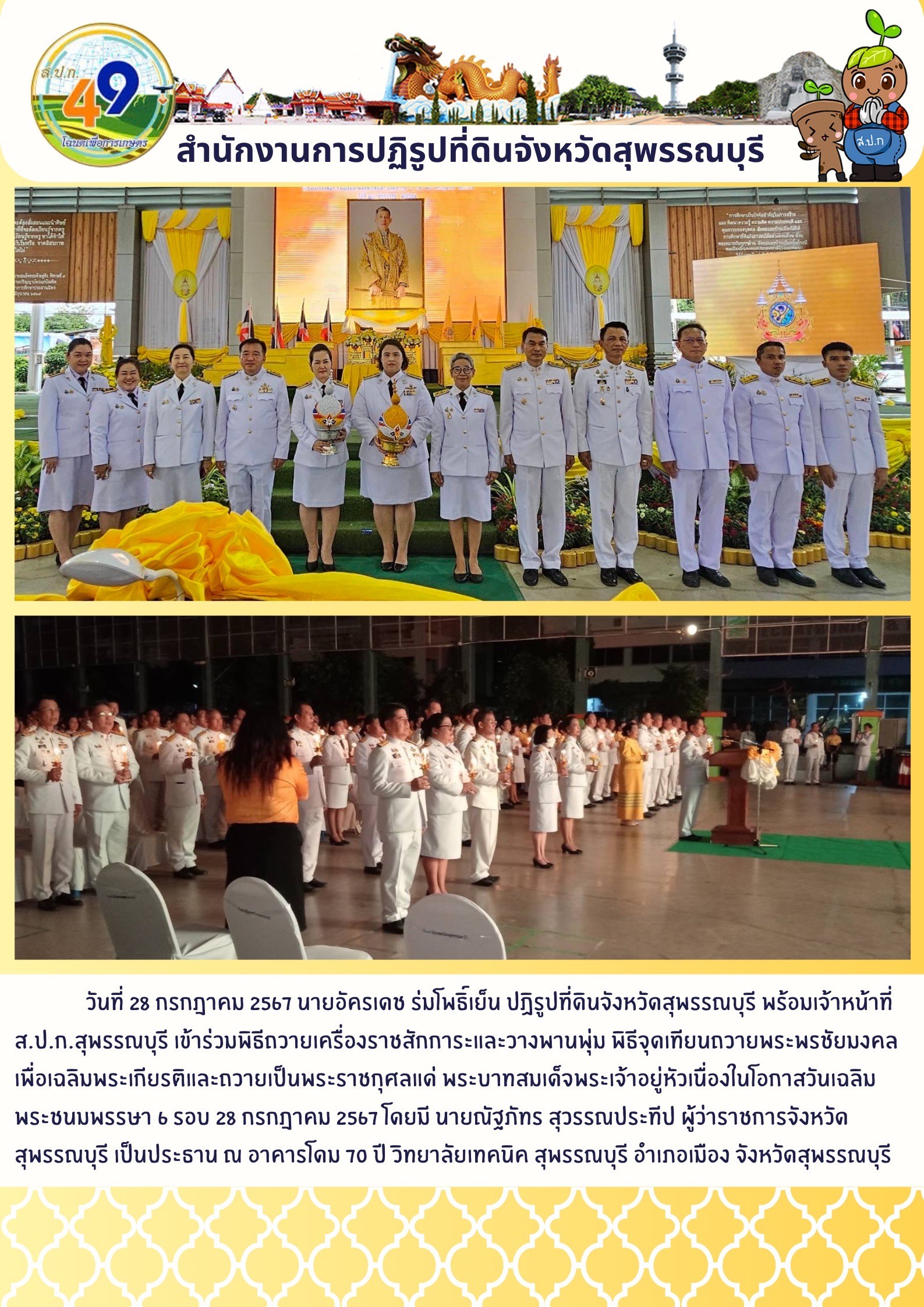 ภาพข่าว เข้าร่วมพิธีเครื่องราชสักการะและวางพานพุ่ม พิธีจุดเทียนถวายพระพรชัยมงคลเพื่อเฉลิมพระเกียรติและถวายเป็นพระราชกุศลแดพระบามสมเด็จพระเจ้าอยู่หัวฯ ครบ 6 รอบ 28 กรกฎาคม 2567 ณ วิทยาลัยเทคนิคสุพรรณบุรี