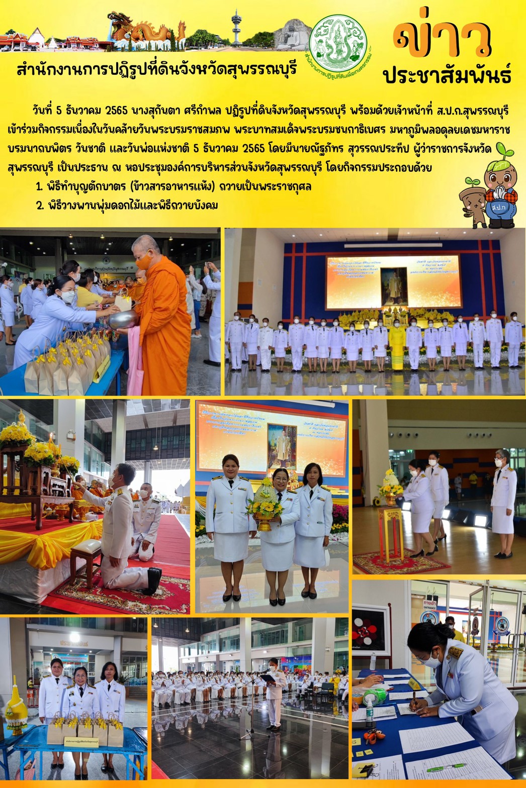 วันที่ 5 ธันวาคม 2565 นางสุกันตา ศรีกำพล ปฏิรูปที่ดินจังหวัดสุพรรณบุรี พร้อมด้วยเจ้าหน้าที่ ส.ป.ก.สุพรรณบุรี เข้าร่วมกิจกรรมเนื่องในวันคล้ายวันพระบรมราชสมภพ พระบาทสมเด็จพระบรมชนกาธิเบศร มหาภูมิพลอดุลยเดชมหาราช บรมนาถบพิตร วันชาติ และวันพ่อแห่งชาติ 5 ธันวาคม 2565 โดยมีนายณัฐภัทร สุวรรณประทีป ผู้ว่าราชการจังหวัดสุพรรณบุรี เป็นประธาน ณ หอประชุมองค์การบริหารส่วนจังหวัดสุพรรณบุรี โดยกิจกรรมประกอบด้วย