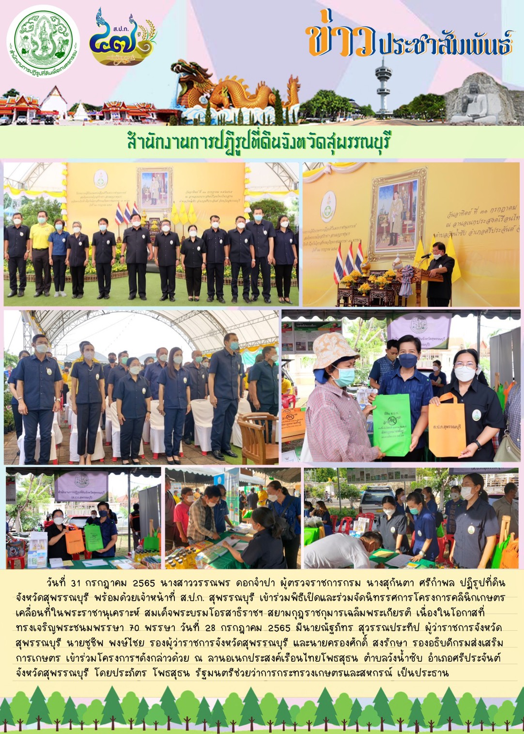 นางสาววรรณพร ดอกจำปา ผู้ตรวจราชการกรม นางสุกันตา ศรีกำพล ปฏิรูปที่ดินจังหวัดสุพรรณบุรี พร้อมด้วยเจ้าหน้าที่ ส.ป.ก.สุพรรณบุรี เข้าร่วมพิธีเปิดและร่วมจัดนิทรรศการโครงการคลินิกเกษตรเคลื่อนที่ในพระราชานุเคราะห์ สมเด็จพระบรมโอรสาธิราชฯ สยามกุฏราชกุมารเฉลิมพระเกียรติ เนื่องในโอกาสที่ทรงเจริญพระชนมพรรษา 70 พรรษา