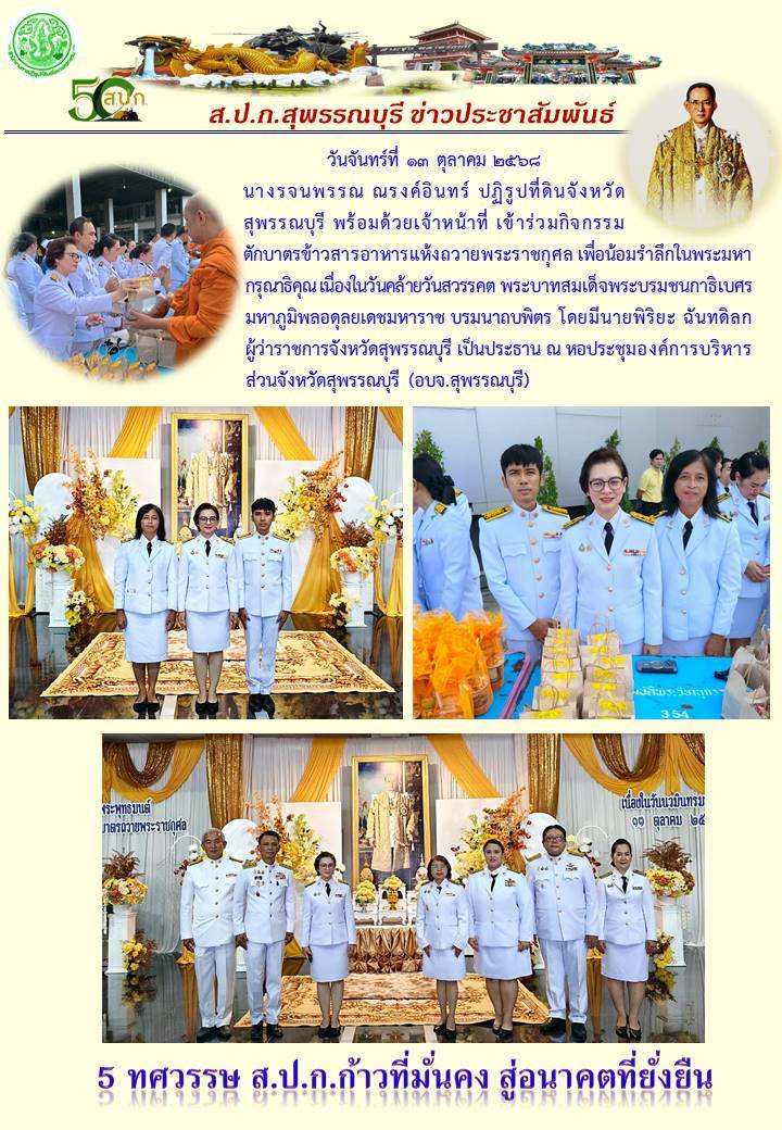 ภาพข่าว ส.ป.ก.สุพรรณบุรี เข้าร่วมกิจกรรมตักบาตรข้าวสารอาหารแห้งถวายเป็นพระราชกุศล เพื่อน้อมรำลึกในพระมหากรุณาธิคุณ เนื่องในวันคล้ายวันสวรรณคต 13 ตุลาคม
