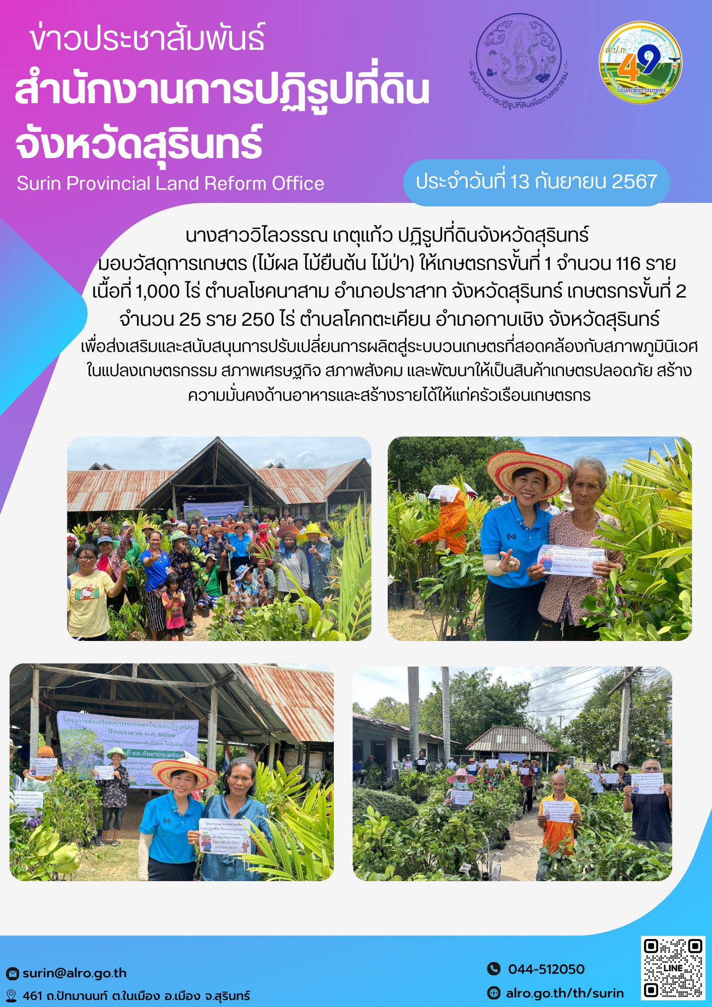 วันที่ 13 กันยายน 2567 นางสาววิไลวรรณ เกตุแก้ว ปฏิรูปที่ดินจังหวัดสุรินทร์ มอบวัสดุการเกษตร (ไม้ผล ไม้ยืนต้น ไม้ป่า) ให้เกษตรกรขั้นที่ 1 จำนวน 116 ราย เนื้อที่ 1,000 ไร่ ตำบลโชคนาสาม อำเภอปราสาท จังหวัดสุรินทร์ เกษตรกรขั้นที่ 2 จำนวน 25 ราย 250 ไร่ ตำบลโคกตะเคียน อำเภอกาบเชิง จังหวัดสุรินทร์ เพื่อส่งเสริมและสนับสนุนการปรับเปลี่ยนการผลิตสู่ระบบวนเกษตรที่สอดคล้องกับสภาพภูมินิเวศ ในแปลงเกษตรกรรม สภาพเศรษฐกิจ สภาพสังคม และพัฒนาให้เป็นสินค้าเกษตรปลอดภัย สร้างความมั่นคงด้านอาหารและสร้างรายได้ให้แก่ครัวเรือนเกษตรกร