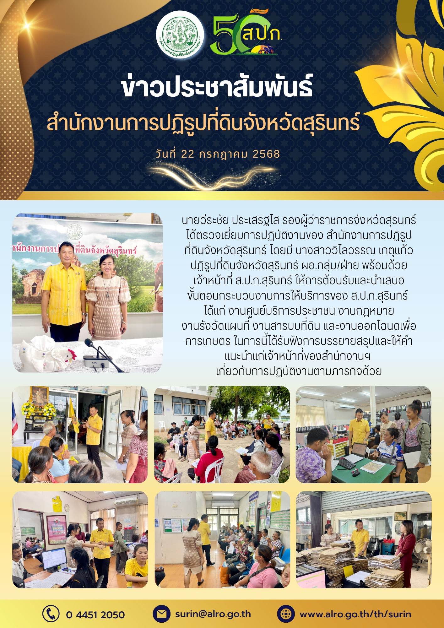 วันที่ 22 กรกฎาคม 2568 นายวีระชัย ประเสริฐโส รองผู้ว่าราชการจังหวัดสรินทร์ ได้ตรวจเยี่ยมการปฏิบัติงานของ สำนักงานการปฏิรูปฏิรูป ที่ดินจังหวัดสุรินทร์ โดยมี นางสาววิไลวรรณ เกตุแก้ว ปฏิรูปที่ดินจังหวัดสุรินทร์ ผอ.กลุ่ม/ฝ้าย พร้อมด้วย เจ้าหน้าที่ ส.ป.ก.สุรินทร์ ให้การต้อนรับและนำเสนอ ขั้นตอนกระบวนงานการให้บริการของ ส.ป.ก.สุรินทร์ ได้แก่ งานศูนย์บริการประชาชน งานกฎหมาย งานรังวัดแผนที่ งานสารบบที่ดิน และถานออกโฉนดเพื่อ การเกษตร ในการนี้ได้รับฟังการบรรยายสรุปและให้คำ แนะนำแก่เจ้าหน้าที่ของสำนักงานฯ เกี่ยวกับการปฏิบัติงานตามภารกิจด้วย