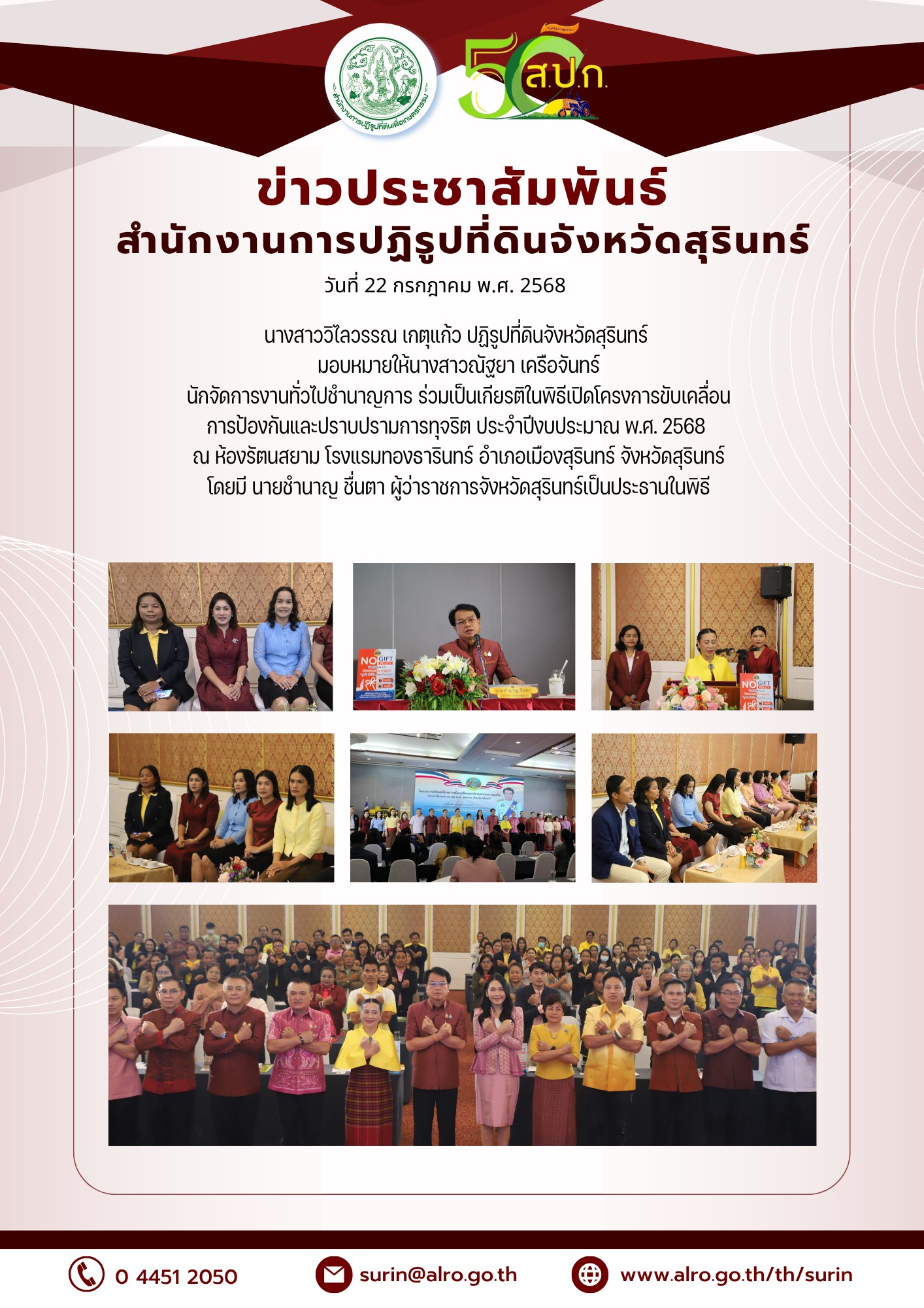 วันที่ 22 กรกฎาคม พ.ศ. 2568 นางสาววิไลวรรณ เกตุแก้ว ปฏิรูปที่ดินจังหวัดสุรินทร์ มอบหมายให้นางสาวณัฐยา เครือจันทร์ นักจัดการงานทั่วไปชำนาญการ ร่วมเป็นเกียรติในพิธีเปิดโครงการขับเคลื่อนการป้องกันและ ปราบปรามการทุจริต ประจำปิ๊งบประมาณ พ.พ.ศ. 2568 ณ ห้องรัตนสยาม โรงแรมทองรารินทร์ อำเภอเมืองสุรินทร์ จังหวัดสุรินทร์ โดยมี นายชำนาญ ชื่นตา ผู้ว่าราชการจังหวัดสุรินทร์ เป็นประธานในพิธี วัตถุประสงค์ของการจัดโครงการฯ พร้อมด้วยหัวหน้าส่วนราชการประจำ จังหวัดสุรินทร์ ร่วมเป็นเกียรติในพิธีเปิดโครงการดังกล่าว