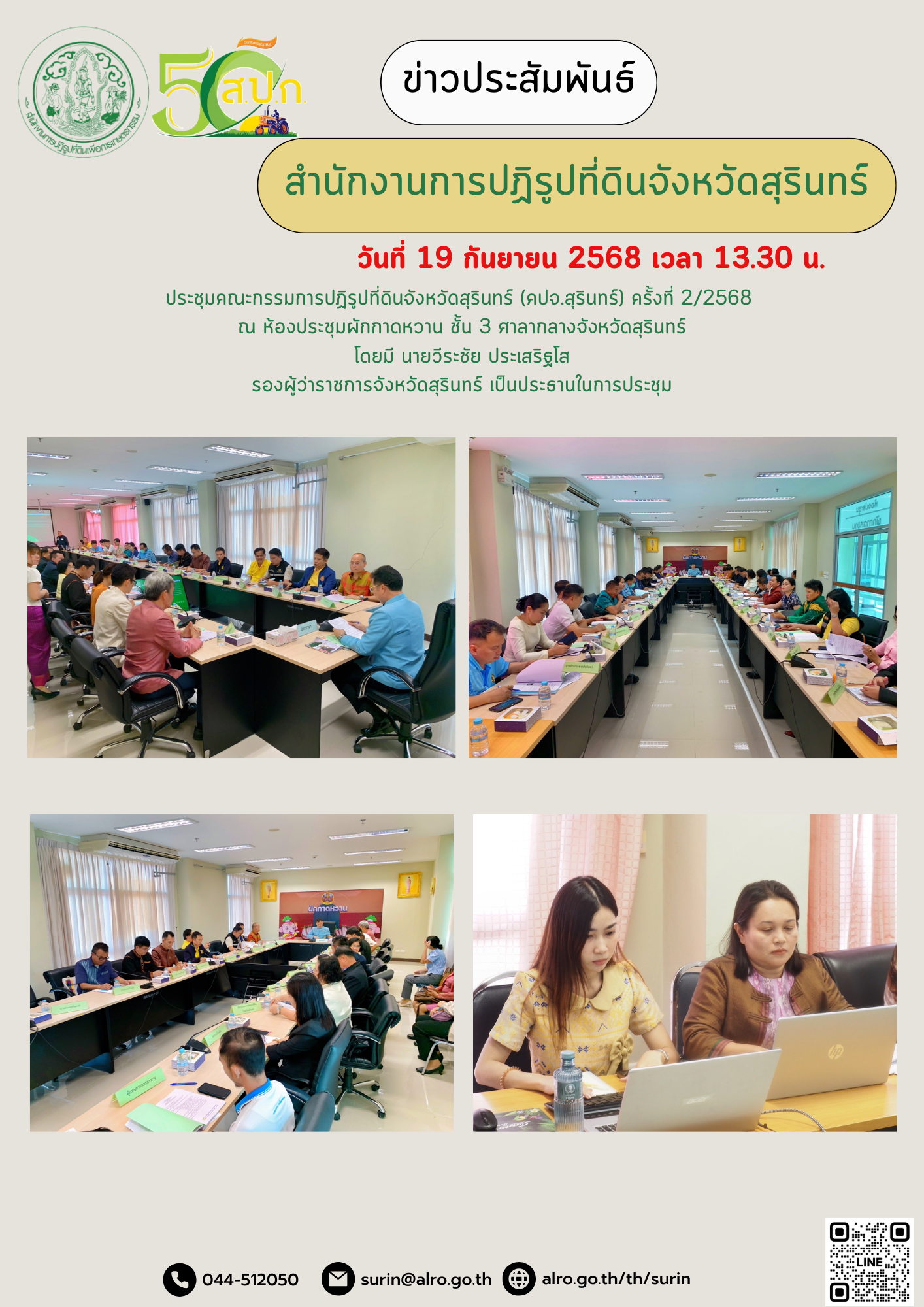 วันที่ 19 กันยายน 2568 เวลา 13.30 น. นายพงษ์พันธุ์ เรืองไทย นายช่างสำรวจอาวุโส รักษาราชการแทนปฏิรูปที่ดินจังหวัดสุรินทร์ พร้อมเจ้าหน้าที่สำนักงานการปฏิรูปที่ดินจังหวัดสุรินทร์ ดำเนินการจัดประชุมคณะกรรมการปฏิรูปที่ดินจังหวัดสุรินทร์ (คปจ.สุรินทร์) ครั้งที่ 2/2568 ณ ห้องประชุมผักกาดหวาน ชั้น 3 ศาลากลางจังหวัดสุรินทร์ โดยมี นายวีระชัย ประเสริฐโส รองผู้ว่าราชการจังหวัดสุรินทร์ เป็นประธานในการประชุม