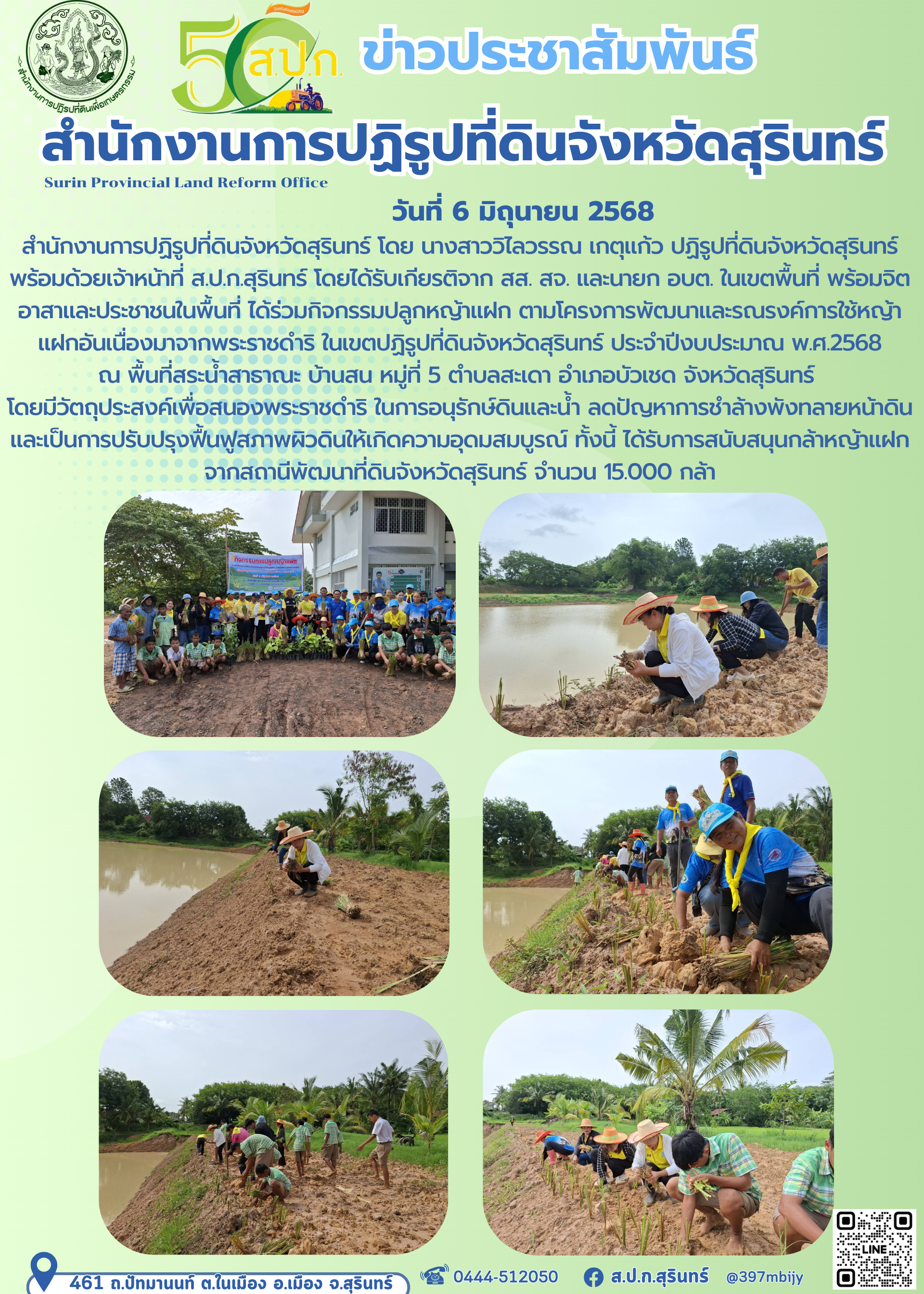 วันที่ 6 มิถุนายน 2568 สำนักงานการปฏิรูปที่ดินจังหวัดสุรินทร์ โดย นางสาววิไลวรรณ เกตุแก้ว ปฏิรูปที่ดินจังหวัดสุรินทร์ พร้อมด้วยเจ้าหน้าที่ ส.ป.ก.สุรินทร์ โดยได้รับเกียรติจาก สส. สจ. และนายก อบต. ในเขตพื้นที่ พร้อมจิตอาสาและประชาชนในพื้นที่ ได้ร่วมกิจกรรมปลูกหญ้าแฝก ตามโครงการพัฒนาและรณรงค์การใช้หญ้าแฝกอันเนื่องมาจากพระราชดำริ ในเขตปฏิรูปที่ดินจังหวัดสุรินทร์ ประจำปีงบประมาณ พ.ศ.2568 ณ พื้นที่สระน้ำสาธาณะ บ้านสน หมู่ที่ 5 ตำบลสะเดา อำเภอบัวเชด จังหวัดสุรินทร์ โดยมีวัตถุประสงค์เพื่อสนองพระราชดำริ ในการอนุรักษ์ดินและน้ำ ลดปัญหาการชำล้างพังทลายหน้าดิน และเป็นการปรับปรุงฟื้นฟูสภาพผิวดินให้เกิดความอุดมสมบูรณ์ ทั้งนี้ ได้รับการสนับสนุนกล้าหญ้าแฝกจากสถานีพัฒนาที่ดินจังหวัดสุรินทร์ จำนวน 15.000 กล้า