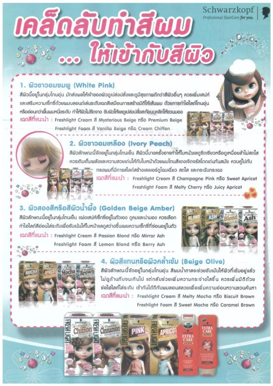 1) ผิวขาวอมชมพู (White Pink) สีผิวนี้อยู่ในกลุ่มโทนอุ่น มักส่งผลให้เจ้าของผิวดูเปล่งปลั่งและดูมีสุขภาพดีกว่าสีผิวอื่นๆ ควรเพิ่มเสน่ห์และเสริมความเซ็กซีด้วยผมลอนด์เล่นระดับเฉดสีเหมือนการสร้างมิติให้เส้นผม ด้วยการทำไฮไลต์โทนอุ่นหรืออ่อนกว่าพื้นผมหนึ่งระดับ ทำให้ผิวไม่ซีดจาง ขับผิวให้แลดูเปล่งปลั่งสะท้อนบุคลิกให้ชวนมอง เฉดสีที่แนะนำ : Freshlight Cream สี Mysterious Being หรือ Premium Being , Freshlight Foam สี Vanilla Being หรือ Cream Chiffon 2) ผิวขาวอมเหลือง (Ivory Peach) สีผิวลักษณะนี้จัดอยู่ในกลุ่มโทนเย็น สีผิวนี้บางครั้งอาจทำให้ใบหน้าแลดูซัดเซียวหรือดูเหนื่อยล้าไม่สดใส ควรเติมเต็มพลังและความสวยเด่นให้กับใบหน้าด้วยผมโทนสีแดงเจิดจรัสโดดเด่นทันสมัย ควบคู่ไปกับทรงผมที่มีการสไลด์สร้างเลเยอร์ดูโฉบเฉี่ยว สดใส และกระฉับกระเฉง เฉดสีที่แนะนำ : Freshlight Cream สี Champagne Pink หรือ Sweet Apricot , Freshlight Foam สี Melty Cherry หรือ Juicy Apricot 3) ผิวสองสีหรือผิวสีน้ำผึ้ง (Golden Being Amber) สีผิวลักษณะนี้จัดอยู่ในกลุ่มโทนเย็น แฝงเสน่ห์เซ็กซี่อยู่ในตัวเอง ดูคมและน่ามอง ควรเลือกทำไฮไลต์สีอ่อนไล่ระดับเพื่อขับเน้นให้ใบหน้าแลดูสว่างขึ้นเผยความเซ็กซี่ที่ซ่อนอยู่ในตัว เฉดสีที่แนะนำ : Freshlight Cream สี Passion Blond หรือ Mirror Ash , Freshlight Foam สี Lemon Blond หรือ Berry Ash 4) ผิวสีแทนหรือผิวคล้ำเข้ม (Being Olive) สีผิวนี้อยู่ในกลุ่มโทนอุ่น สีผมน้ำตาลจะช่วยขับเน้นให้ผิวที่เข้มอยู่แล้วไม่ดูด้านทึบจนเกินไป แต่กลับช่วยเพิ่มความกระจ่างใสขึ้น ควรเพิ่มมิติด้วยช่อไฮไลต์ไล่ระดับ เข้ากันได้ดีกับผมลอนสลวยเพื่อเพิ่มความอ่อนหวานชวนค้นหา เฉดสีที่แนะนำ : Freshlight Cream สี Melty Mocha หรือ Bisciut Brown , Freshlight Foam สี Sweet Mocha หรือ Caramel Brown
