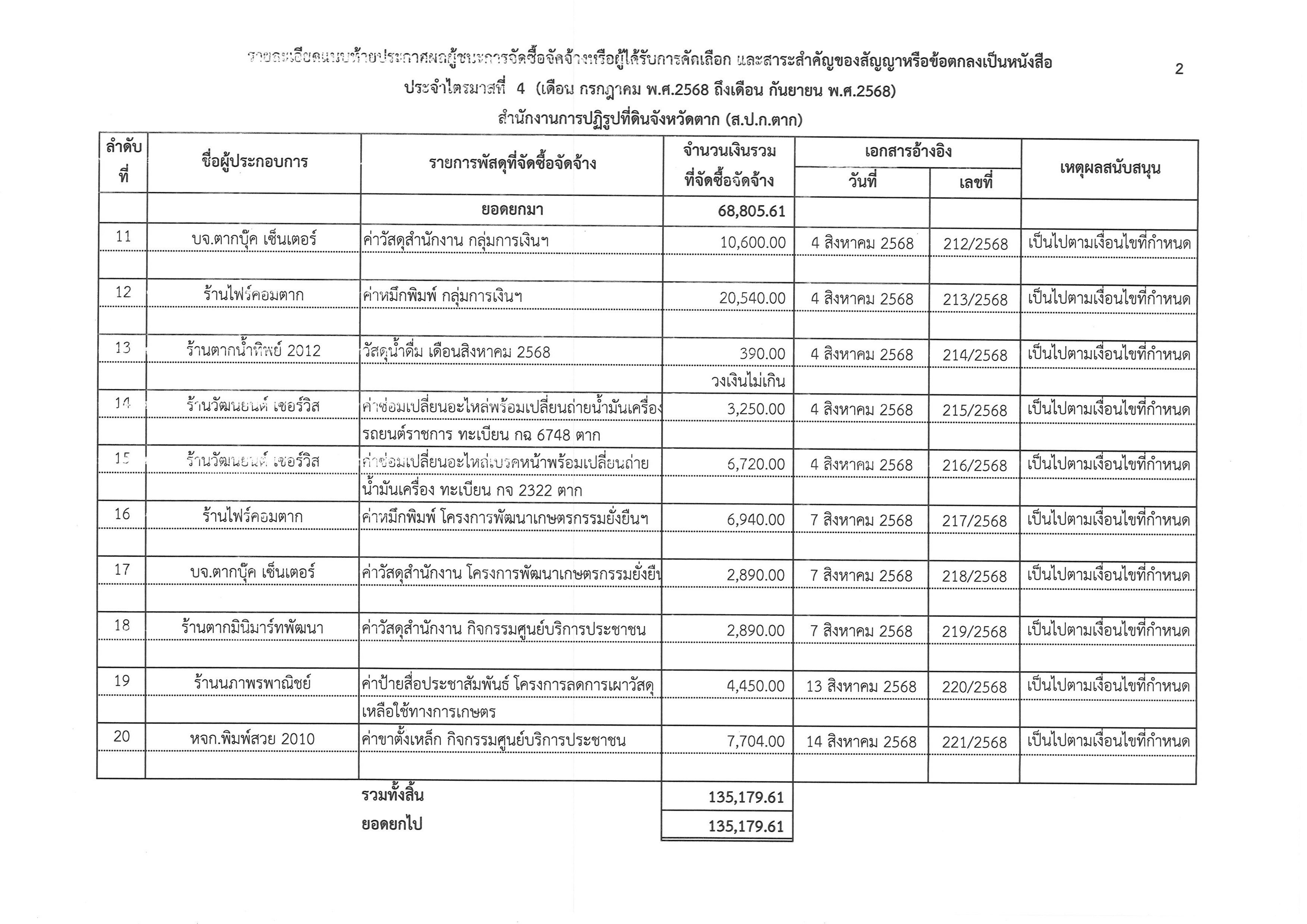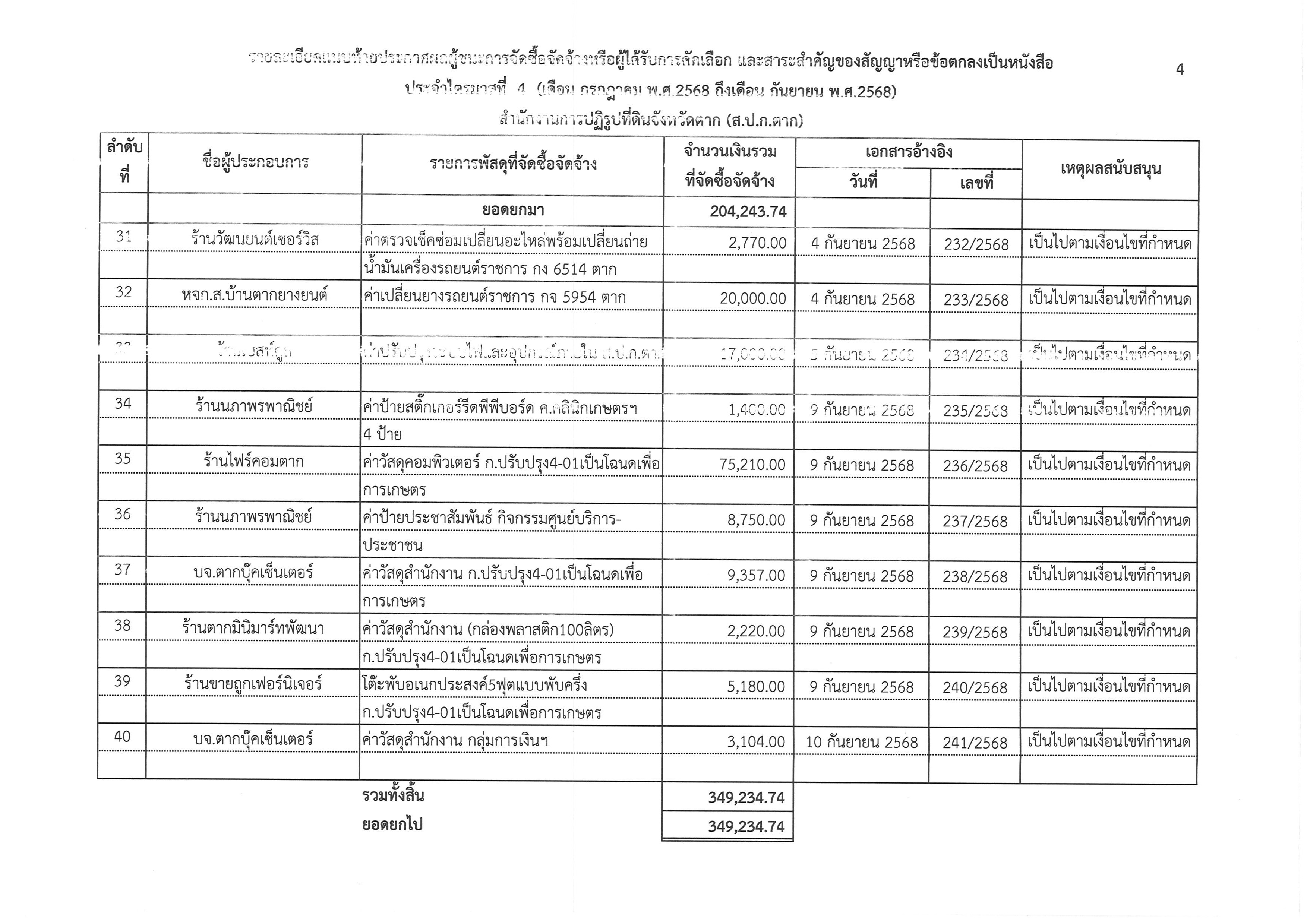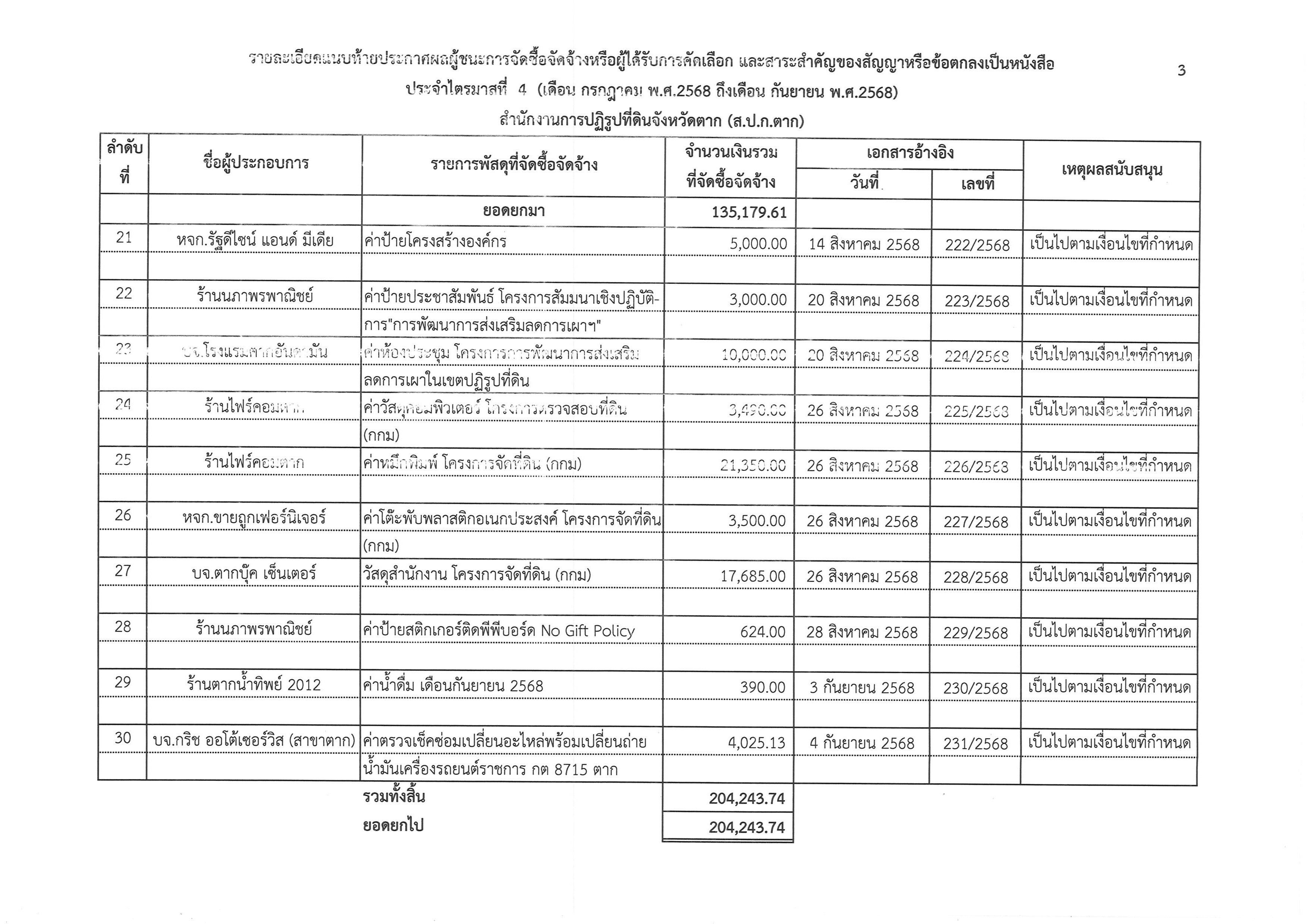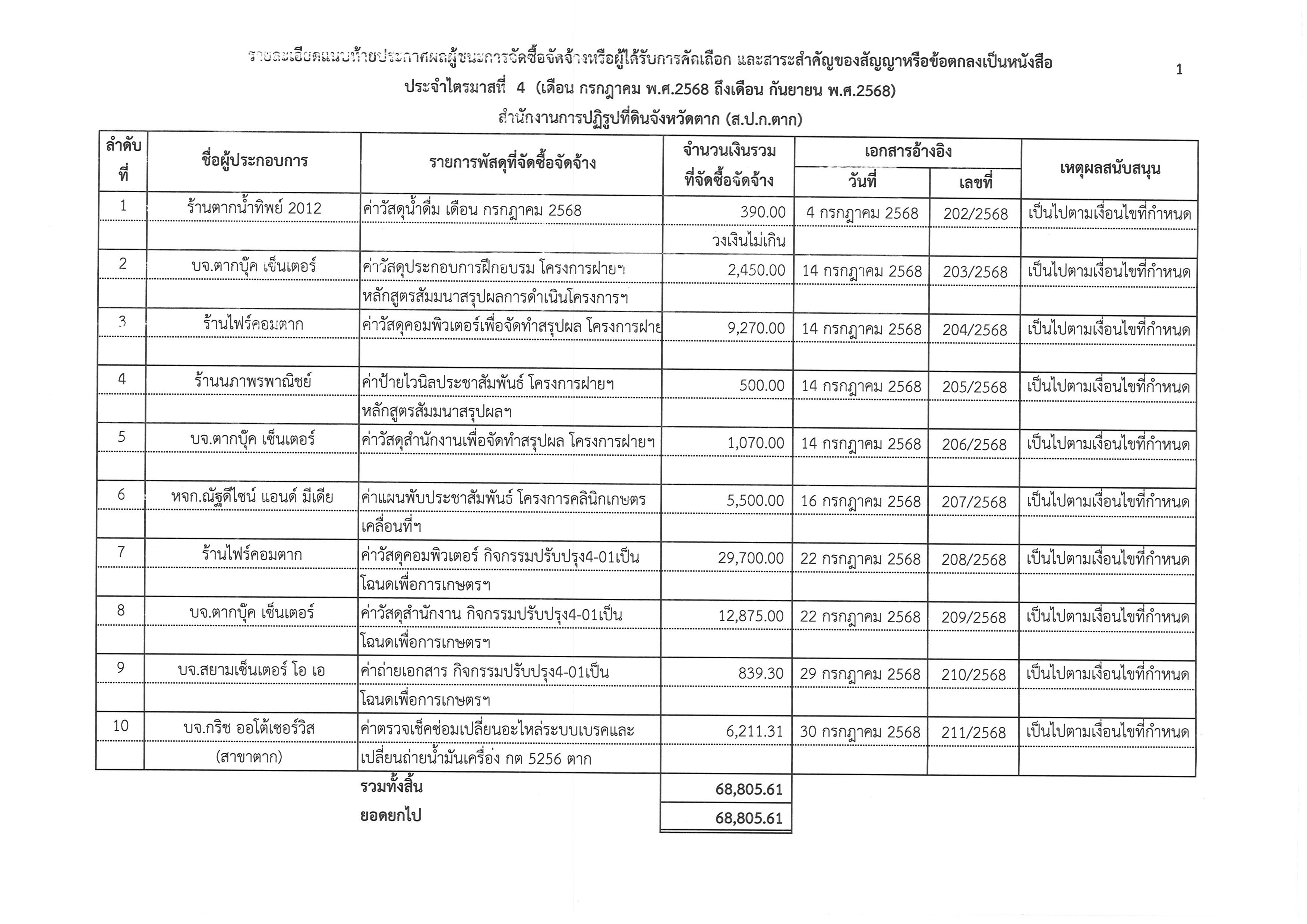 ประกาศสำนักงานการปฏิรูปที่ดินจังหวัดตาก เรื่อง ประกาศผลผู้ชนะการจัดซื้อจัดจ้างหรือผู้ได้รับการคัดเลือกและสาระสำคัญของสัญญาหรือข้อตกลงเป็นหนังสือ ประจำไตรมาสที่ 4 (เดือนกรกฎาคม พ.ศ.2568 ถึงเดือนกันยายน พ.ศ.2568)