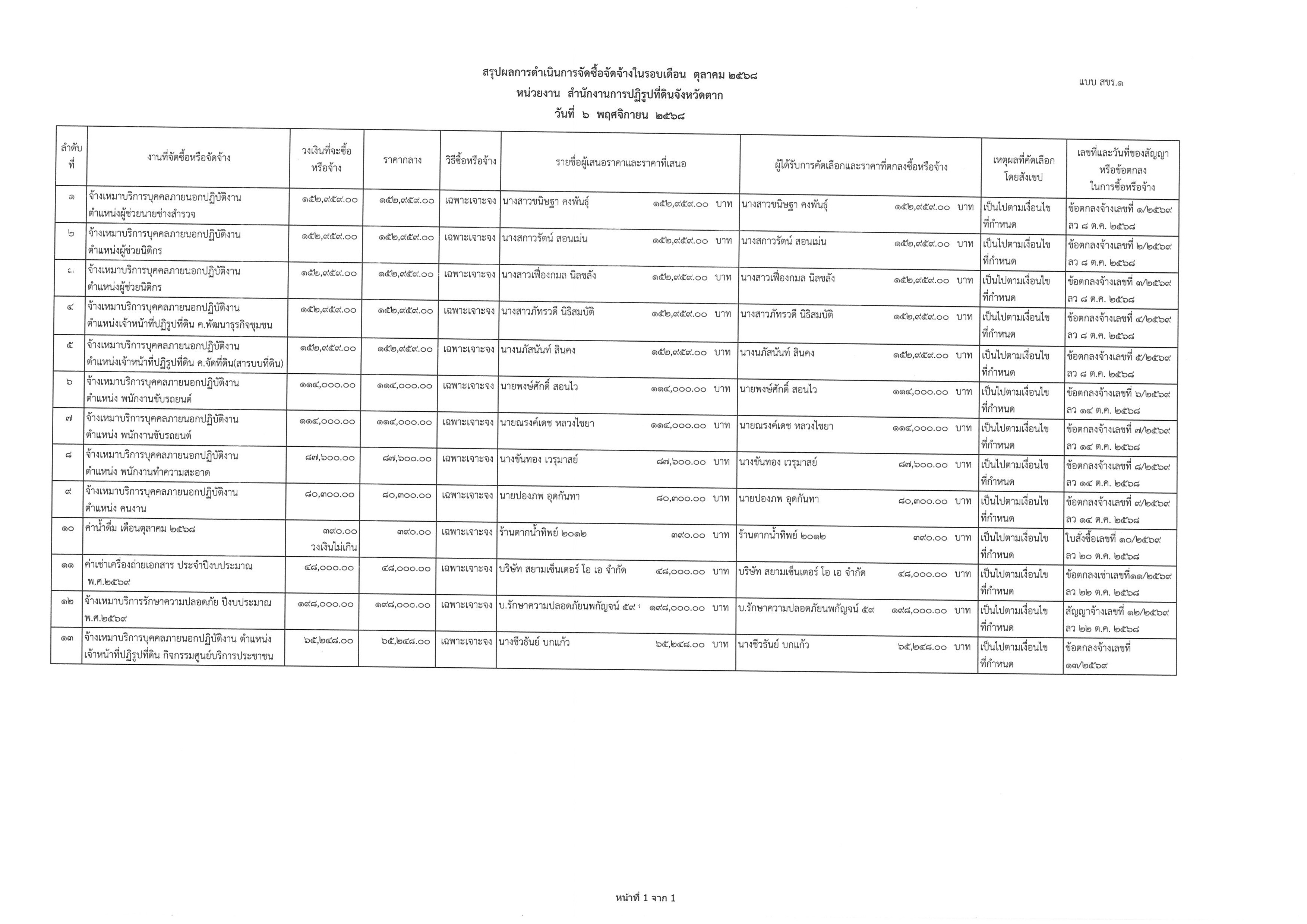 สรุปผลการดำเนินงานจัดซื้อจัดจ้างเดือนตุลาคม 2568 ตามแบบ สขร.1