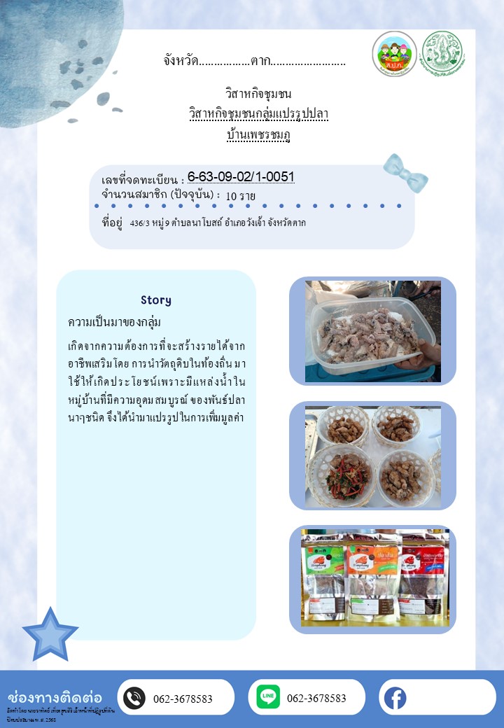 1. วิสาหกิจชุมชนกลุ่มแปรรูปปลา บ้านเพชรชมภู ต.นาโบสถ์ อ.วังเจ้า จ.ตาก