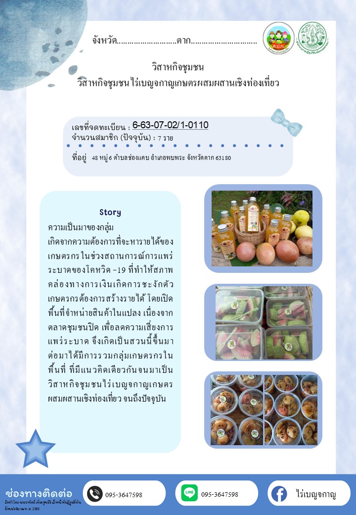7. วิสาหกิจชุมชนไร่เบญจกาญเกษตรผสมผสานเชิงท่องเที่ยว ต.ช่องแคบ อ.พบพระ จ.ตาก