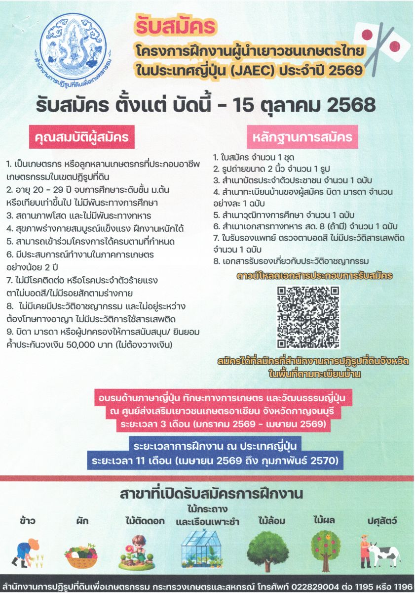 ประชาสัมพันธ์รับสมัครเยาวชนเกษตรในเขตปฏิรูปที่ดินเข้าร่วมโครงการฝึกงานผู้นำเยาวชนเกษตรไทยในประเทศญี่ปุ่นประจำปีงบประมาณ พ.ศ. 2569