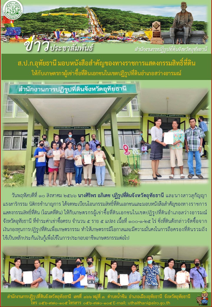 ส.ป.ก.อุทัยธานี มอบหนังสือสำคัญของทางราชการแสดงกรรมสิทธิ์ที่ดินให้กับเกษตรกรผู้เช่าซื้อที่ดินเอกชนในเขตปฏิรูปที่ดินอำเภอสว่างอารมณ์