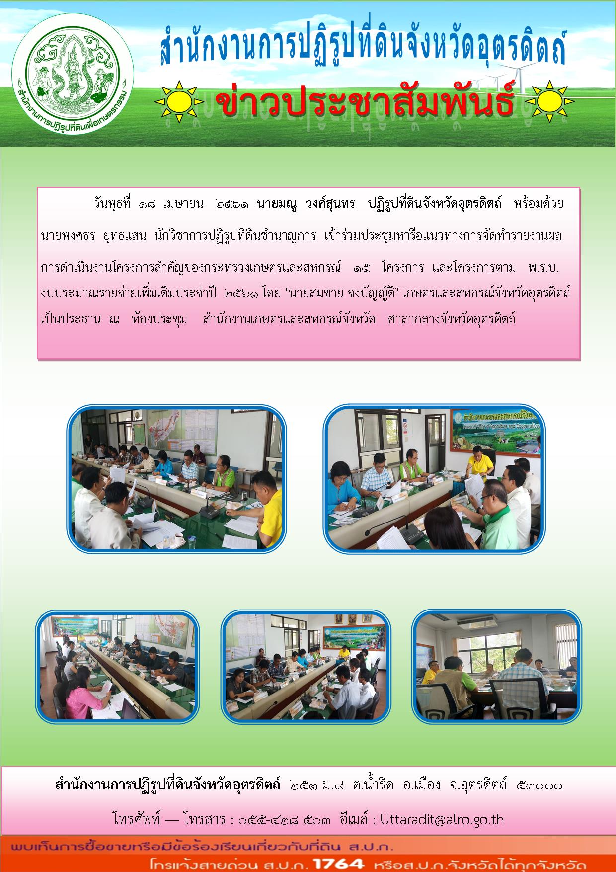 นายมณู วงศ์สุนทร ปฏิรูปที่ดินจังหวัดอุตรดิตถ์ เข้าร่วมประชุมหารือแนวทางการจัดทำรายงานผล การดำเนินงานโครงการสำคัญของกระทรวงเกษตรและสหกรณ์ 15 โครงการ และโครงการตาม พ.ร.บ.งบประมาณรายจ่ายเพิ่มเติมประจำปี 2561 เมื่อวันพุธที่ 18 เมษายน 2561