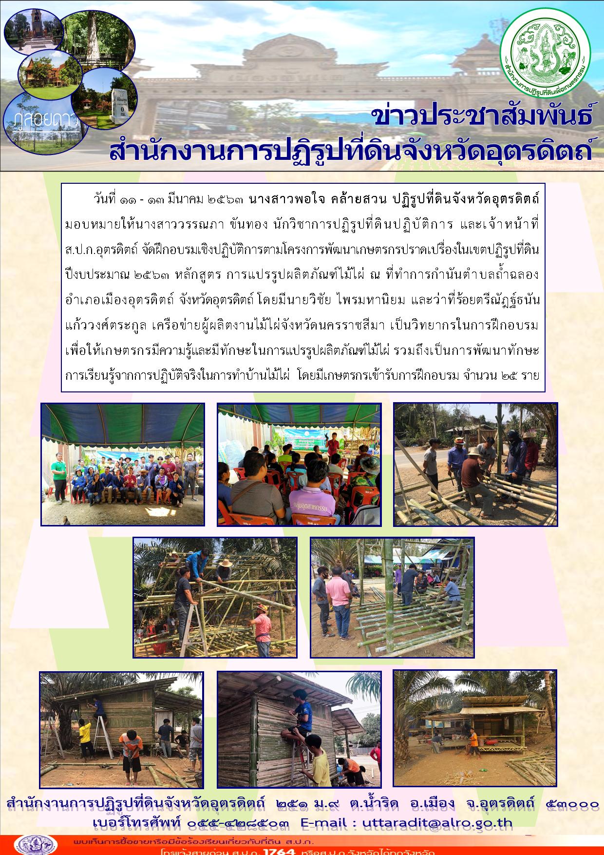ส.ป.ก.อุตรดิตถ์ จัดฝึกอบรมเชิงปฏิบัติการตามโครงการพัฒนาเกษตรกรปราดเปรื่องในเขตปฏิรูปที่ดิน ปีงบประมาณ 2563 หลักสูตร การแปรรูปผลิตภัณฑ์ไม้ไผ่ ณ ที่ทำการกำนัน ต.ถ้ำฉลอง อ.เมืองอุตรดิตถื จ.อุตรดิตถ์ เมื่อวันที่ 11-13 มี.ค.63