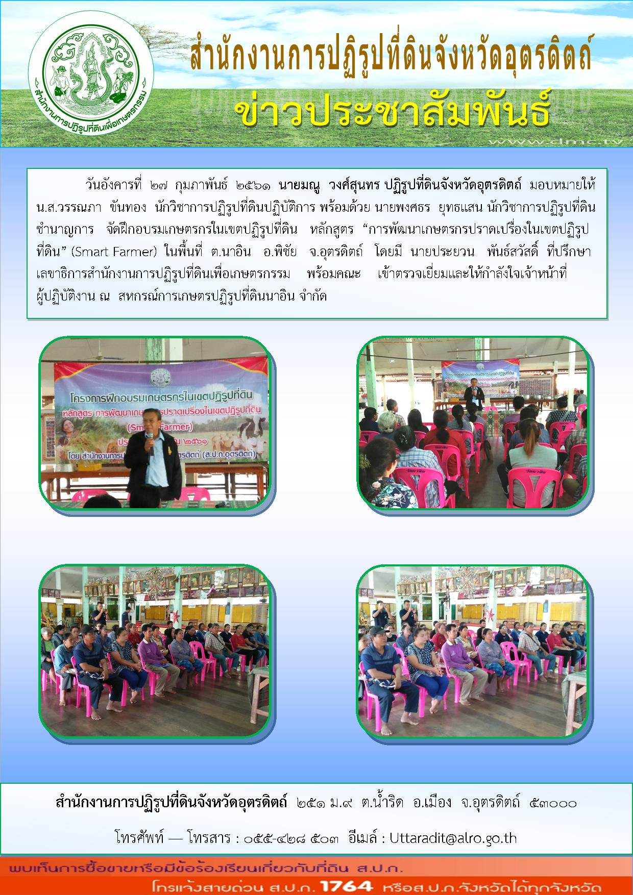 ส.ป.ก.อุตรดิตถ์ จัดฝึกอบรมโครงการ การพัฒนาเกษตรกรปราดเปรื่องในเขตปฏิรูปที่ดิน (Smart Farmer) โดยมีนายประยวน พันธ์สวัสดิ์ ที่ปรึกษาเลขาธิการ ส.ป.ก. พร้อมคณะเข้าตรวจเยี่ยมและให้กำลังใจ เมื่อวันอังคารที่ 27 กุมภาพันธ์ 2561 ณ สหกรณ์การเกษตรปฏิรูปท