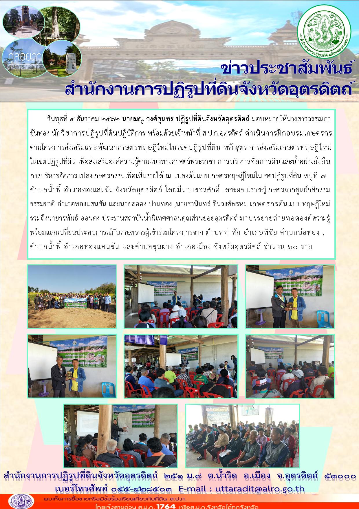 ส.ป.ก.อุตรดิตถ์ ดำเนินการฝึกอบรมเกษตรกรตามโครงการส่งเสริมและพัฒนาเกษตรทฤษฎีใหม่ในเขตปฏิรูปที่ดิน หลักสูตร การส่งเสริมเกษตรทฤษฎีใหม่ในเขตปฏิรูปที่ดิน ณ แปลงต้นแบบเกษตรทฤษฎีใหม่ในเขตปฏิรูปที่ดิน ม.7 ต.น้ำพี้ อ.ทองแสนขัน จ.อุตรดิตถ์ เมื่อวันพุธที่ 4 ธ.ค. 62