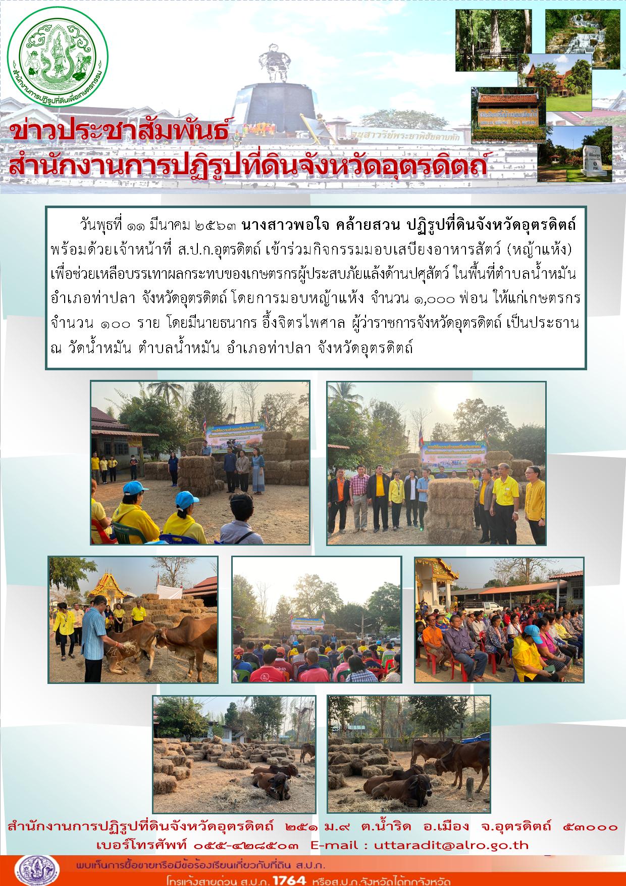 ส.ป.ก.อุตรดิตถ์ เข้าร่วมกิจกรรมมอบเสบียงอาหารสัตว์ (หญ้าแห้ง) เพื่อช่วยเหลือบรรเทาผลกระทบของเกษตรกรผู้ประสบภัยแล้งด้านปศุสัตว์ ณ วัดน้ำหมัน ต.น้ำหมัน อ.ท่าปลา จ.อุตรดิตถ์ เมื่อวันพุธที่ 11 มี.ค.63