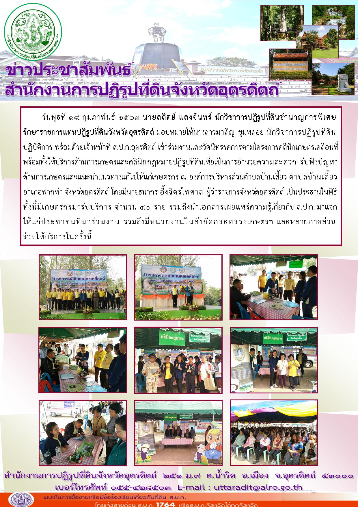 ส.ป.ก.อุตรดิตถ์ เข้าร่วมงานและจัดนิทรรศการตามโครงการคลินิกเกษตรเคลื่อนที่ ณ องค์การบริหารส่วนตำบลบ้านเสี้ยว ต.บ้านเสี้ยว อ.ฟากท่า จ.อุตรดิตถ์ ในวันพุธที่ 19 ก.พ.63